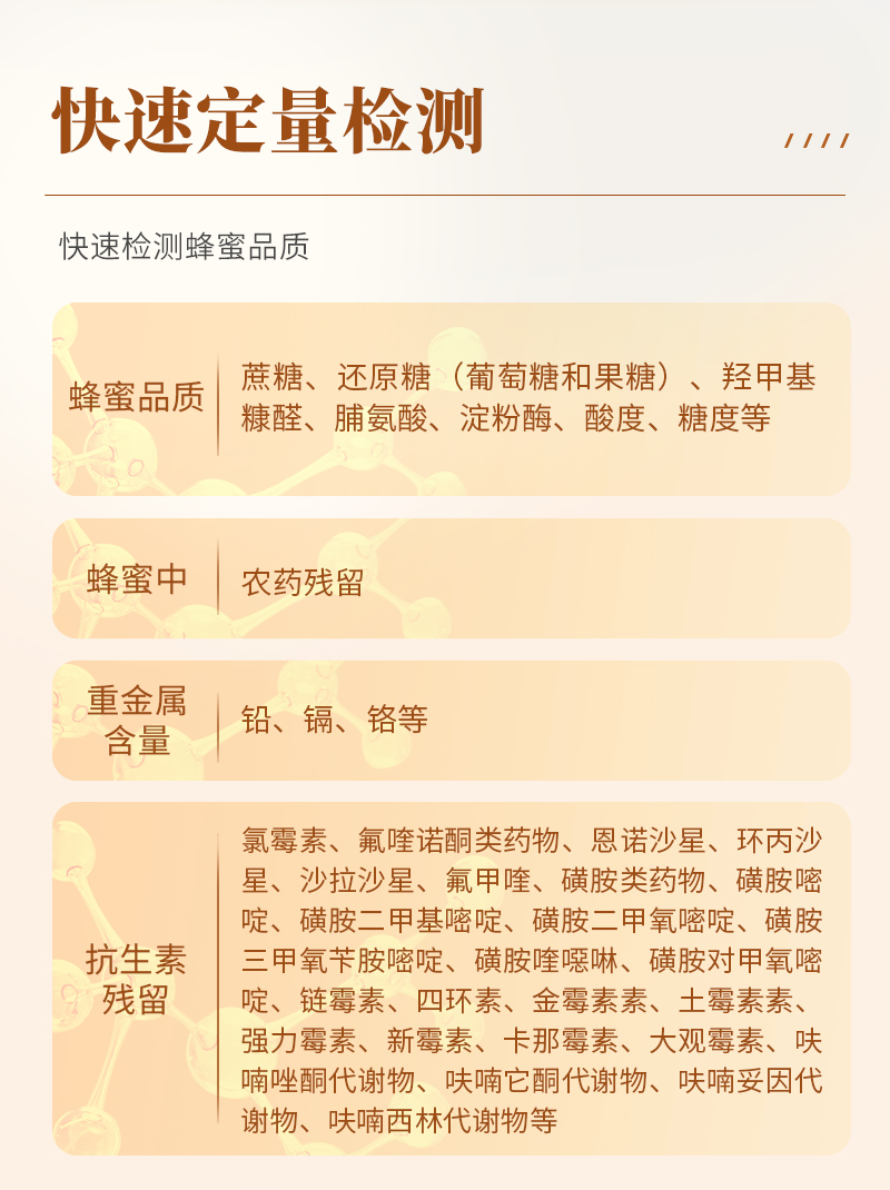 | 食品添加劑:二氧化硫、雙氧水、亞硝酸鹽、硝酸鹽、苯甲酸鈉、山梨酸鉀、糖精鈉、甜蜜素、木耳硫酸鎂等 | 有毒有害物質(zhì):甲醛、吊白塊、硼砂、過(guò)氧化苯甲酰、溴酸鉀、羅丹明B、三聚氰胺、蘇丹紅、工業(yè)堿、尿素、明礬等 | 食用油脂:過(guò)氧化值、酸價(jià)等 | 果蔬:農(nóng)藥殘留(酶抑制率法) | 病害肉:組胺、揮發(fā)性鹽基氮 | 重金屬含量:鉛、鎘、鉻、汞、砷、錫、鎳、鋁等 | 水酒飲品分析:酒中甲醇、乙醇、乳品及牛奶中蛋白質(zhì), | 蜂蜜成分:果糖和葡萄糖、蔗糖、淀粉酶、酸度等 | 調(diào)味品成分:食醋的總酸、醬油的總酸、芝麻油純度、谷氨酸鈉、醬油氨基酸態(tài)氮、食鹽中亞鐵氰化鉀、食鹽中碘等 | 食用色素類:紅色色素(胭脂紅、莧菜紅、莧菜紅)、黃色色素(檸檬黃、日落黃)、藍(lán)色色素(亮藍(lán))等 |