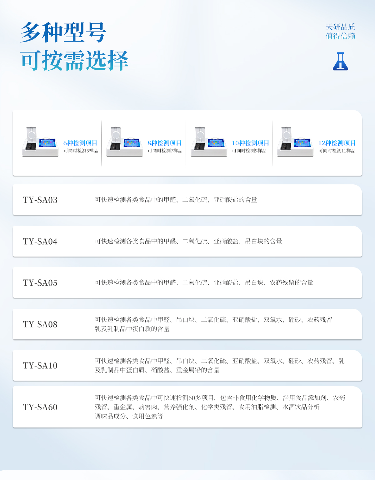 可快速檢測各類食品中的甲醛、二氧化硫、亞硝酸鹽、吊白塊的含量,儀器預(yù)留其他項目檢測程序和端口,根據(jù)日后需求可方便的自主增加檢測項目。
