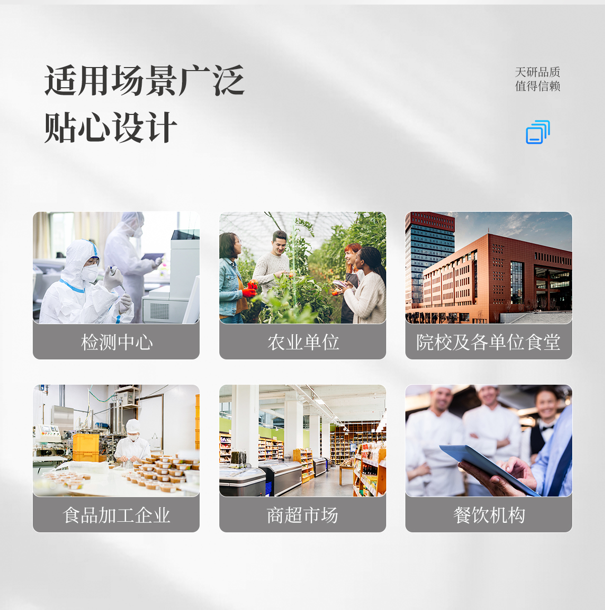 多功能食品安全檢測儀可快速檢測200多項目,包含非食用化學(xué)物質(zhì)、濫用食品添加劑、農(nóng)藥殘留、獸藥殘留、重金屬、病害肉、營養(yǎng)強(qiáng)化劑、抗生素類殘留、激素類殘留、真菌毒素類殘留、化學(xué)類殘留等現(xiàn)場的定性定量檢測。該多功能食品安全檢測儀為集成化食品安全快速檢測分析設(shè)備,廣泛應(yīng)用于市場監(jiān)管局、檢測中心、衛(wèi)生監(jiān)督部門、農(nóng)業(yè)部門、院校及各單位食堂、食品肉產(chǎn)品深加工企業(yè)、商超市場、司法部門、餐飲機(jī)構(gòu)、養(yǎng)殖場、屠宰場、檢驗檢疫部門等單位使用。