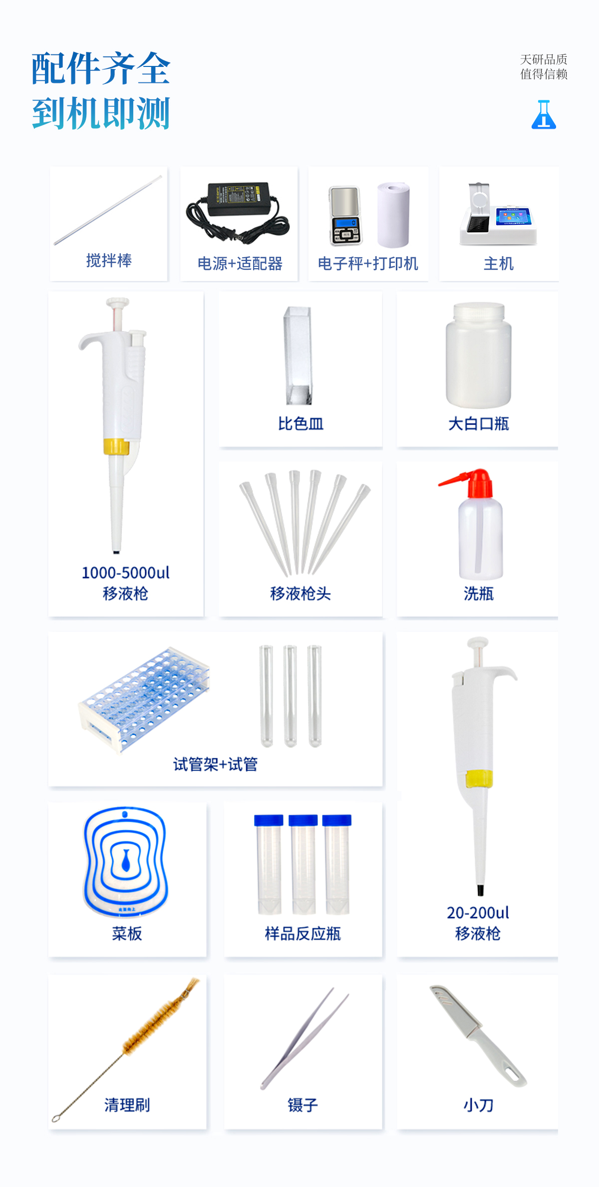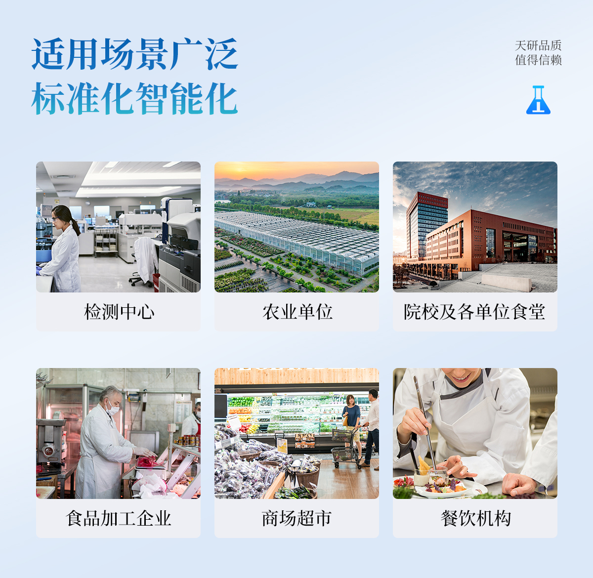 多功能食品安全檢測儀可快速檢測200多項(xiàng)目,包含非食用化學(xué)物質(zhì)、濫用食品添加劑、農(nóng)藥殘留、獸藥殘留、重金屬、病害肉、營養(yǎng)強(qiáng)化劑、抗生素類殘留、激素類殘留、真菌毒素類殘留、化學(xué)類殘留等現(xiàn)場的定性定量檢測。該多功能食品安全檢測儀為集成化食品安全快速檢測分析設(shè)備,廣泛應(yīng)用于市場監(jiān)管局、檢測中心、衛(wèi)生監(jiān)督部門、農(nóng)業(yè)部門、院校及各單位食堂、食品肉產(chǎn)品深加工企業(yè)、商超市場、司法部門、餐飲機(jī)構(gòu)、養(yǎng)殖場、屠宰場、檢驗(yàn)檢疫部門等單位使用。