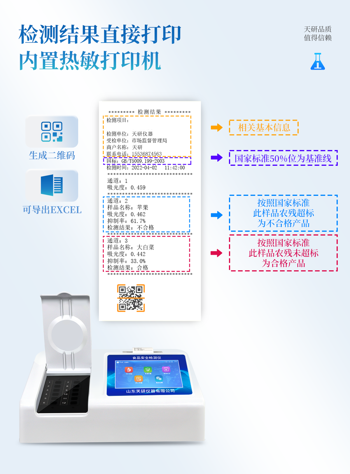 | 安卓智能操作系統(tǒng),采用更加**和人性化操作,儀器具有網(wǎng)線連接、wifi聯(lián)網(wǎng)上傳、GPRS無線遠(yuǎn)傳功能,快速上傳數(shù)據(jù)。 | 智能化程度高,儀器具有自檢功能:具有開機(jī)自檢和調(diào)零功能,具有自動檢測重復(fù)性功能。 | 檢測通道:≥12個檢測通道,可以同時(shí)測試多個樣品,每個樣品由程序控制分別獨(dú)立工作,不會互相干擾。 | 顯示方式:≥8英寸液晶觸摸屏顯示,人性化中文操作界面,讀數(shù)直觀、簡單。 | 配備新一代嵌入式熱敏打印機(jī),可選擇手動打印或者自動打印,檢測完成可自動打印檢測報(bào)告和二維碼。 | 光源采用進(jìn)口超高亮發(fā)光二極管,高精度、穩(wěn)定性強(qiáng)、光源可控、可以關(guān)掉不使用的光源,功耗更低。 | 采用USB2.0接口設(shè)計(jì),方便數(shù)據(jù)的存貯和移動,并可隨時(shí)與計(jì)算機(jī)直接相連,并且可用計(jì)算機(jī)控制儀器。實(shí)現(xiàn)數(shù)據(jù)查詢、瀏覽、分析、統(tǒng)計(jì)、打印等。 | 儀器帶有監(jiān)管平臺。數(shù)據(jù)可局域網(wǎng)和互聯(lián)網(wǎng)數(shù)據(jù)上傳,檢測結(jié)果直接傳至食品安全監(jiān)管平臺。進(jìn)行區(qū)域食品安全監(jiān)管及大數(shù)據(jù)分析處理,檢測區(qū)域食品安全長短期動態(tài),達(dá)到食品安全問題預(yù)估、預(yù)警 | 一體化便攜式快檢設(shè)備,滿足現(xiàn)場及流動檢測使用需求,能夠在同一軟件下實(shí)現(xiàn)所有檢測項(xiàng)目的檢測,并可通過同一窗口直觀顯示檢測結(jié)果。 | 儀器具有多品類多種類樣品菜單庫,可靈活選擇檢測樣品,不同的檢測通道可同時(shí)檢測不同的樣品項(xiàng)目。也可在儀器上直接編輯錄入樣品名稱、檢測指標(biāo)、送檢單位等信息并保存進(jìn)樣品數(shù)據(jù)庫。 | 樣品處理簡單省力,整體操作快速、安全、便捷。 | 儀器具有自身保護(hù)功能,可設(shè)置用戶名及密碼,防止非工作人員操作等。 | 高靈敏度,高檢測精度,高重復(fù)性精度,掃描式高精度光學(xué)傳感器。 | 儀器具有重新校準(zhǔn)、鎖定、恢復(fù)出廠設(shè)置功能。 | 支持U盤存儲。 結(jié)果判定線可修改,對照值標(biāo)定值可保存,斷電不丟失數(shù)據(jù)。 |