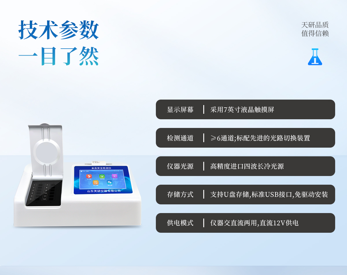 | 主控芯片采用ARM Cortex-A7,RK3288/4核處理器,主頻1.88Ghz,運(yùn)轉(zhuǎn)速度更快速,穩(wěn)定性更強(qiáng)。 | 直流12V供電,可連接車載電源,可配6ah大容量充電鋰電池,方便戶外流動測試。 | 四波長冷光源,每個通道均配置410、520、590、630nm波長光源,標(biāo)配**的光路切換裝置,**光路切換功能可實(shí)現(xiàn)*多64波長,并且所有檢測項(xiàng)目可實(shí)現(xiàn)所有通道同時(shí)檢測。 | 光源亮度自動調(diào)節(jié)與校準(zhǔn) | 智能恒流穩(wěn)壓,光強(qiáng)自動校準(zhǔn),長時(shí)間連續(xù)工作光源無溫漂現(xiàn)象 | 內(nèi)置新國家限量標(biāo)準(zhǔn),與所測結(jié)果進(jìn)行現(xiàn)場比對,并持續(xù)更新標(biāo)準(zhǔn) | 不間斷進(jìn)樣,連續(xù)檢測 | 樣本編號自動累加。 | 檢測項(xiàng)目可擴(kuò)充。 | 檢測結(jié)果可批量打印,批量上傳。 | 數(shù)據(jù)無線上傳平臺,并可從平臺導(dǎo)出為Excel表格。 | 檢測結(jié)果存儲容量20萬條 | 同時(shí)支持U盤拷貝,標(biāo)準(zhǔn)USB接口,免驅(qū)動插拔。 | 可配置大容量鋰電池,固件可升級。 | 儀器尺寸;42×31×20。 | 儀器凈重:3.6kg。 |