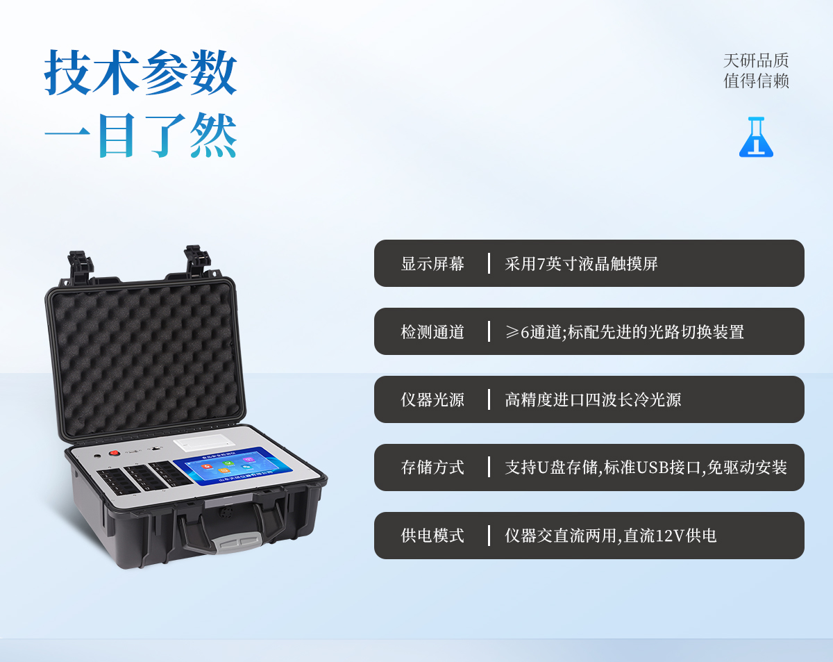 | 主控芯片采用ARM Cortex-A7,RK3288/4核處理器,主頻1.88Ghz,運(yùn)轉(zhuǎn)速度更快速,穩(wěn)定性更強(qiáng)。 | 顯示方式:7英寸液晶觸摸屏顯示,人性化中文操作界面,讀數(shù)直觀、簡單。 | 交直流兩用,直流12V供電,可連接車載電源,可配6ah大容量充電鋰電池,方便戶外流動(dòng)測試。 | 四波長冷光源,6個(gè)檢測通道,每個(gè)通道均配置410、520、590、630nm波長光源,標(biāo)配**的光路切換裝置,專業(yè)光路切換功能可實(shí)現(xiàn)*多64波長,并且所有檢測項(xiàng)目可實(shí)現(xiàn)所有通道同時(shí)檢測。 | 智能恒流穩(wěn)壓,光強(qiáng)自動(dòng)調(diào)節(jié)與校準(zhǔn),長時(shí)間連續(xù)工作光源無溫漂現(xiàn)象。 | 內(nèi)置新國家限量標(biāo)準(zhǔn),與所測結(jié)果進(jìn)行現(xiàn)場比對,并持續(xù)更新標(biāo)準(zhǔn)。 | 不間斷進(jìn)樣,連續(xù)檢測 | 樣本編號自動(dòng)累加。 | 數(shù)據(jù)無線上傳平臺(tái),并可從平臺(tái)導(dǎo)出為Excel表格。 | 檢測結(jié)果存儲(chǔ)容量20萬條 | 同時(shí)支持U盤拷貝,標(biāo)準(zhǔn)USB接口,免驅(qū)動(dòng)插拔。 | 檢測項(xiàng)目可擴(kuò)充,固件可升級 | 儀器尺寸:43×35×19cm, 主機(jī)凈重:5.1kg |