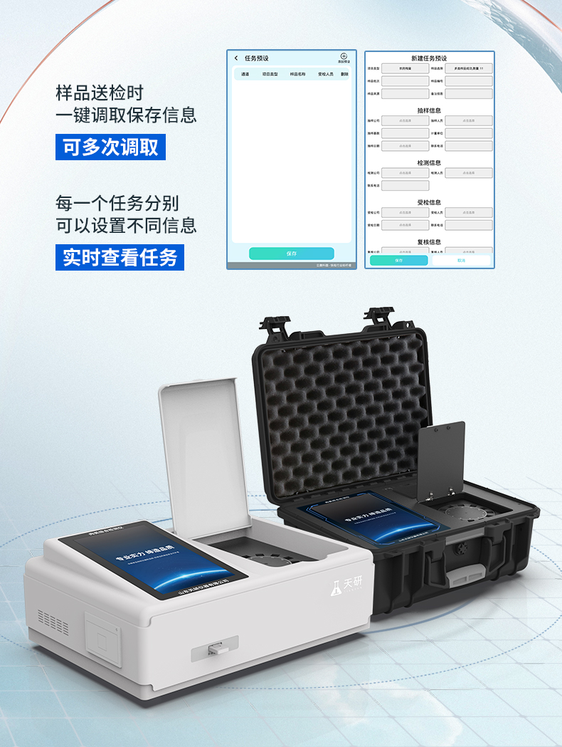 | 儀器采用手提式一體化系統(tǒng)檢測技術(shù),將分光光度模塊、膠體金檢測模塊、新型農(nóng)殘檢測模塊、數(shù)字化管理模塊、無線通訊模塊高度集成于一體,支持檢測200種食品安全檢測項(xiàng)目,同時(shí)預(yù)留升級(jí)檢測方法。 | 儀器檢測模塊標(biāo)準(zhǔn)化、智能化,檢測項(xiàng)目可隨意自由組合。檢測箱體內(nèi)置多個(gè)標(biāo)準(zhǔn)檢測單元,檢測模塊可以調(diào)整配置。 | 顯示屏幕:儀器采用10.1英寸豎向液晶觸摸屏顯,搭配運(yùn)行安卓智能操作系統(tǒng),主控芯片采用ARM Cortex-A7,RK3288/4核處理器,主頻1.88Ghz,操作方便,性能更強(qiáng)。 | 檢測通道:≥12通道;采用精密旋轉(zhuǎn)比色池設(shè)計(jì),使用同芯片同光源校準(zhǔn)精度,解決不同光源之間的誤差值,更加準(zhǔn)確**。(1-12通道間誤差0.1%,**號(hào):ZL202022821055.2) | 儀器光源:高精度進(jìn)口四波長冷光源,每個(gè)通道均配置 410、520、590、630nm 波長光源,標(biāo)配**的光路切換裝置,**光路切換功能可實(shí)現(xiàn)64波長,并且所有檢測項(xiàng)目可實(shí)現(xiàn)所有通道同時(shí)檢測。 | 設(shè)備可一鍵校準(zhǔn),自動(dòng)保存校準(zhǔn)數(shù)據(jù),自動(dòng)對比校驗(yàn),得到精準(zhǔn)光源,采用Android SP存儲(chǔ)數(shù)據(jù),光源數(shù)據(jù)永不丟失,方便每一次使用。 | 通訊接口:配備無線通信模塊、4G(APN)通訊模塊、藍(lán)牙傳輸,同時(shí)具有雙USB接口以及RJ45網(wǎng)線接口,可以多方式實(shí)現(xiàn)數(shù)據(jù)保存及數(shù)據(jù)傳輸 | 存儲(chǔ)方式:支持U盤存儲(chǔ),標(biāo)準(zhǔn)USB接口,免驅(qū)動(dòng)安裝。檢測結(jié)果存儲(chǔ)容量20萬條以上,可生成Excel表格進(jìn)行拷貝,并具有登錄保護(hù)功能。 | 智能化操作系統(tǒng): | 1)操作系統(tǒng):儀器可在同一檢測界面自動(dòng)對應(yīng)相關(guān)檢測通道,一次性選擇1-12個(gè)樣品名稱,無需退出界面,節(jié)省操作時(shí)間。并可以對每個(gè)通道屬性和樣品信息單獨(dú)進(jìn)行編輯,例如送檢單位、人員,檢測人員等,打印時(shí)勾選打印顯示。 | 2)數(shù)據(jù)集成系統(tǒng):設(shè)備首頁自動(dòng)匯總分析檢測數(shù)據(jù),包含:周檢測數(shù)據(jù)、月檢測數(shù)據(jù),全部檢測總數(shù)量,均包含檢測總數(shù),合格數(shù),不合格數(shù),以及相關(guān)柱形分析圖,各項(xiàng)檢測數(shù)據(jù)一目了然,無需電腦查詢,更加快捷直觀。 | 3)數(shù)據(jù)庫系統(tǒng):十幾項(xiàng)數(shù)據(jù)庫分類管理儀器:包含項(xiàng)目類型、項(xiàng)目數(shù)據(jù)、檢測數(shù)據(jù)、歷史記錄、國標(biāo)信息、曲線信息、采樣信息、檢測信息、受檢信息、復(fù)核信息、圖表信息、光源校準(zhǔn)信息、打印樣式信息、樣品庫信息等等,數(shù)據(jù)庫之間互相協(xié)調(diào)聯(lián)動(dòng)保證數(shù)據(jù)的真實(shí)完整性。同時(shí)產(chǎn)品數(shù)據(jù)庫以及歷史檢測記錄支持一鍵檢索功能。 | 4)限量規(guī)判系統(tǒng):具有限量查詢、添加物質(zhì)合規(guī)判定系統(tǒng)。檢測出結(jié)果后,系統(tǒng)自動(dòng)調(diào)用系統(tǒng)數(shù)據(jù)庫中相關(guān)國標(biāo)進(jìn)行比對判定,客觀顯示判定結(jié)果是否合格。 | 5)項(xiàng)目預(yù)設(shè)系統(tǒng):儀器具有任務(wù)預(yù)設(shè)模塊,一鍵提前預(yù)設(shè),給出方便快捷的新檢測方案,每一個(gè)任務(wù)分別可以設(shè)置不同的樣品、批次、編號(hào)、來源、備注、抽樣信息、檢測信息、受檢信息、復(fù)核信息等更多信息。樣品送檢時(shí)一鍵調(diào)取保存信息,并可多次調(diào)取,大大提高檢測效率。 | 6)數(shù)據(jù)監(jiān)管系統(tǒng):同步對接監(jiān)管平臺(tái),數(shù)據(jù)可局域網(wǎng)和互聯(lián)網(wǎng)數(shù)據(jù)上傳,檢測結(jié)果可選擇直接傳至食品安全監(jiān)管平臺(tái)。進(jìn)行區(qū)域食品安全監(jiān)管及大數(shù)據(jù)分析處理與數(shù)據(jù)統(tǒng)計(jì),檢測區(qū)域食品安全長短期動(dòng)態(tài),達(dá)到食品安全問題預(yù)估、預(yù)警。 | 7)打印系統(tǒng):內(nèi)置全新打印機(jī),新創(chuàng)自定義打印方式,可按需靈活勾選控制:產(chǎn)品合格證(國家農(nóng)業(yè)部標(biāo)準(zhǔn)要求),二維碼,抽樣信息、檢測信息,受檢信息、復(fù)核信息、抽樣日期、檢測日期等信息的打印。 | 供電模式:儀器交直流兩用,直流12V供電,可連接車載電源,可配6ah大容量充電鋰電池,電量可實(shí)時(shí)顯示,方便戶外流動(dòng)測試。 | 膠體金檢測模塊:采用雙通道CMOS成像處理技術(shù)及膠體金免疫層析技術(shù),可同時(shí)讀取雙膠體金卡數(shù)據(jù),自動(dòng)采集、處理分析,將檢測結(jié)果顯示,并可根據(jù)參考限值自動(dòng)判斷檢測結(jié)果,可檢測常見的獸藥殘留、生物毒素、抗生素、違禁添加物等。 | 1)探測技術(shù):CMOS成像探測; | 2)檢測通道:1個(gè)通道; | 3)檢測方式:消線法和比色法; | 4)顯示模式:陰性或陽性; | 5)曲線形式:軌道式掃描方式,顯示金標(biāo)卡圖像,實(shí)時(shí)生成、識(shí)別CT曲線圖,無需手動(dòng)調(diào)整,完成檢測后自動(dòng)退出檢測卡。兼容市場上其他金標(biāo)卡,使用耗材不受限制。 | 儀器加入遠(yuǎn)程升級(jí)功能,可定向分客戶分儀器更新,開機(jī)后