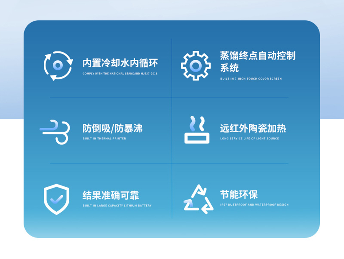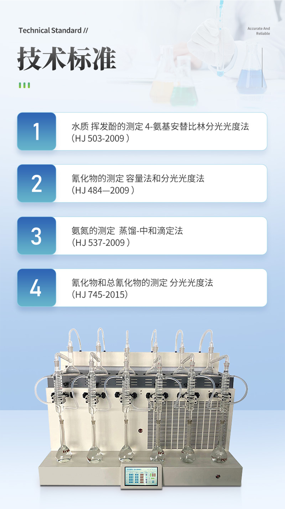 該儀器實驗了控溫、自動防倒吸、加熱均勻、防止暴沸、智能終點控制等功能。使用方便,節(jié)能環(huán)保。經過實驗室蒸餾回收率比對驗證,結果準確,回收率達95%以上。該儀器可廣泛適用于環(huán)保、疾控、水產、供排水、高校、科研院所、廠礦企業(yè)等各類化學實驗室需要蒸餾處理的場所,如揮發(fā)酚、氨氮、凱氏氮油中水分等項目的蒸餾處理。