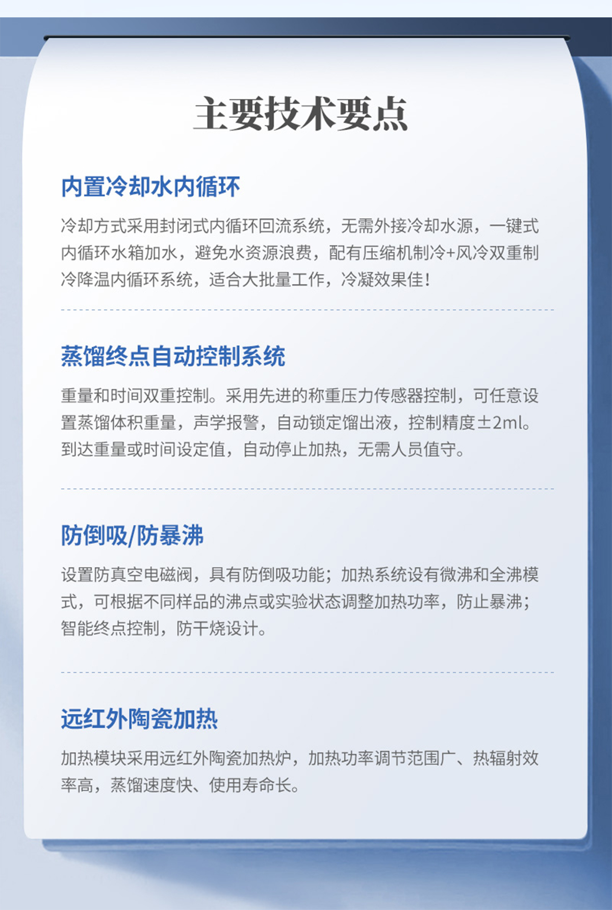 | 1、加熱方式:采用遠紅外陶瓷加熱爐,紅外線輻射加熱(無明火加熱、防水); | 2、加熱單元:6個,可單孔單控制; | 3、升溫時間:5-8min; | 4、蒸餾速度:2-12ml/min; | 5、蒸餾終點控制:自動偵測蒸餾終點功能,采用稱重和時間雙重控制,蒸餾體積控制在±2ml之內,自動化程度高; | 6、單爐加熱功率:0-450W(單孔可調); | 7、加熱功率:0-2700W(可調); | 8、冷卻方式:封閉式內循環(huán)回流系統(tǒng),也可外接冷卻水源; | 9、防倒吸:設有防真空電磁閥,具有防倒吸功能; | 10、時間控制:0-200min可調; | 11、蒸餾瓶規(guī)格:500mlX6,250 X6 更多規(guī)格可選; | 12、額定電壓/頻率:220V/50HZ; |