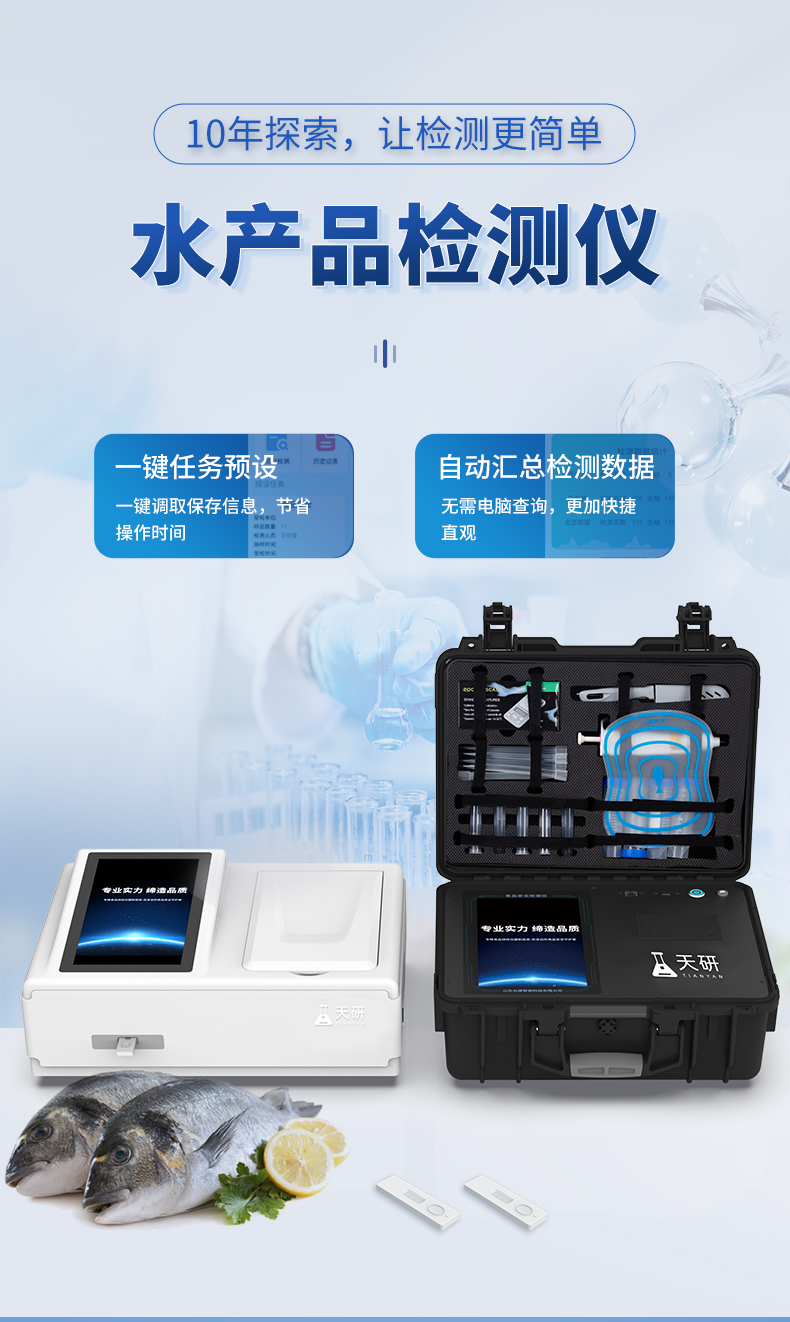 山東天研儀器有限公司生產(chǎn)的水產(chǎn)品安全檢測(cè)儀可適用于魚(yú)、蝦等水產(chǎn)中孔雀石綠、氯霉素、硝基呋喃類:呋喃唑酮(AOZ)、呋喃它酮( AMOZ )、呋喃妥因(AHD)、呋喃西林(SEM)、呋喃那斯、磺胺類、激素類、四環(huán)素類、金霉素、土霉素、甲砜霉素、氟苯尼考、喹諾酮類藥物:噁喹酸、諾氟沙星、恩諾沙星、環(huán)丙沙星、氧氟沙星等藥物殘留的定性檢測(cè) 該儀器廣泛應(yīng)用于食藥監(jiān)局、衛(wèi)生監(jiān)督部門(mén)、農(nóng)業(yè)部門(mén)、商業(yè)系統(tǒng)養(yǎng)殖場(chǎng)、屠宰場(chǎng)、食品肉產(chǎn)品深加工企業(yè)、畜牧獸醫(yī)、檢驗(yàn)檢疫部門(mén)、食品生產(chǎn)企業(yè)、農(nóng)副產(chǎn)品批發(fā)市場(chǎng)、農(nóng)業(yè)生產(chǎn)基地、超市、餐廳、高教院校、食堂等單位部門(mén)對(duì)食品中的不安全指標(biāo)進(jìn)行監(jiān)測(cè)使用。