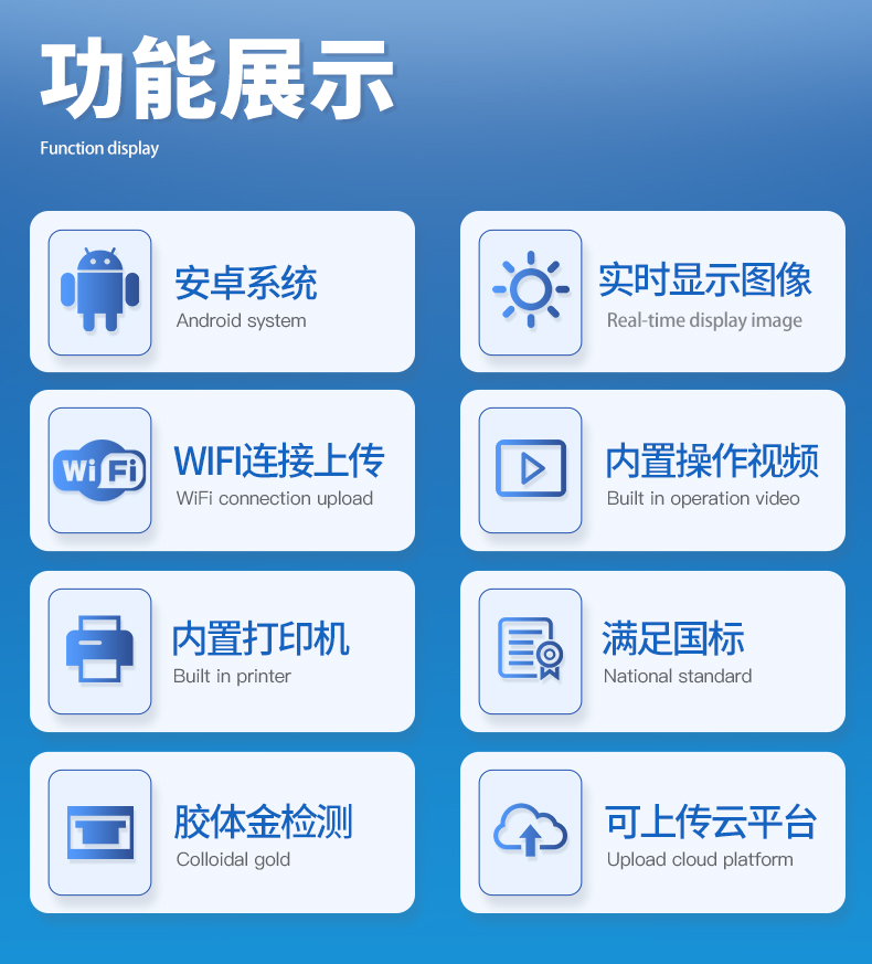 | 儀器采用10.1英寸液晶觸摸屏顯,搭配運(yùn)行安卓智能操作系統(tǒng),主控芯片采用ARM Cortex-A7,RK3288/4核處理器,主頻1.88Ghz,運(yùn)轉(zhuǎn)速度更快速,性能更強(qiáng)。 | 儀器功能包括:膠體金檢測(cè)模塊、數(shù)字化管理模塊、無(wú)線通訊模塊等,可以滿足同一軟件下實(shí)現(xiàn)所有檢測(cè)項(xiàng)目的檢測(cè),并在同一窗口展示檢測(cè)結(jié)果。 | 一體化便攜式快檢設(shè)備,采用交直流兩用供電方式,可連接車(chē)載電源,配備6ah大容量充電鋰電池,可以滿足現(xiàn)場(chǎng)及流動(dòng)檢測(cè)使用的需求。儀器尺寸:43×35×20cm, 主機(jī)凈重:5.1kg | 系統(tǒng)自帶數(shù)據(jù)集成模塊,設(shè)備首頁(yè)自動(dòng)統(tǒng)計(jì)檢測(cè)數(shù)據(jù)包含:周檢測(cè)數(shù)據(jù)、月檢測(cè)數(shù)據(jù),全部檢測(cè)總數(shù)量,均包含檢測(cè)總數(shù),合格數(shù),不合格數(shù),以及相關(guān)柱形分析圖,對(duì)各項(xiàng)檢測(cè)數(shù)據(jù)清晰掌握,無(wú)需電腦查詢,更加快捷直觀。 | 儀器具有任務(wù)預(yù)設(shè)模塊,可在樣品送檢前提前預(yù)設(shè)樣品名稱、檢測(cè)指標(biāo)、送檢單位等信息,樣品送檢時(shí)一鍵調(diào)取保存信息,檢測(cè)更加方便快捷。 | 膠體金檢測(cè)模塊:軌道式自動(dòng)傳輸掃描方式,可實(shí)時(shí)顯示金標(biāo)卡實(shí)時(shí)圖像,系統(tǒng)自動(dòng)分析并呈現(xiàn)出CT曲線圖,CT線自動(dòng)識(shí)別,無(wú)需手動(dòng)調(diào)整,完成檢測(cè)后自動(dòng)退出檢測(cè)卡。 結(jié)果判定線可修改,對(duì)照值標(biāo)定值可保存,斷電不丟失數(shù)據(jù)。 兼容市場(chǎng)上其他膠體金卡,使用耗材不受限制,極大增強(qiáng)用戶使用體驗(yàn)。 | 儀器檢測(cè)系統(tǒng)擁有龐大數(shù)據(jù)庫(kù),并且構(gòu)建了完善的檢索、修訂功能。食品庫(kù)涵蓋多種樣品名稱,可按需添加或刪除、編輯樣品名稱;產(chǎn)品數(shù)據(jù)庫(kù)以及歷史檢測(cè)記錄支持一鍵檢索功能。 | 系統(tǒng)打印自定義化,打印格式多樣化,產(chǎn)品合格證(國(guó)家標(biāo)準(zhǔn)要求),二維碼,抽樣信息、檢測(cè)信息,受檢信息、復(fù)核信息、抽樣日期、檢測(cè)日期等信息結(jié)果,可按需求自行設(shè)置打印內(nèi)容。 | A4紙版本報(bào)告打印功能(可選配):設(shè)備擁有兩種結(jié)果展示方式,可以自動(dòng)生成A4打印模板和小票打印模板兩種樣式,可通過(guò)WiFi及網(wǎng)線等方式鏈接外置打印機(jī)可進(jìn)行打印 | 儀器具有 wifi 聯(lián)網(wǎng)上傳、RJ45網(wǎng)線連接功能,可以快速上傳數(shù)據(jù)。同步對(duì)接監(jiān)管平臺(tái),數(shù)據(jù)可局域網(wǎng)和互聯(lián)網(wǎng)數(shù)據(jù)上傳,檢測(cè)結(jié)果直接傳至食品安全監(jiān)管平臺(tái)。進(jìn)行區(qū)域食品安全監(jiān)管及大數(shù)據(jù)分析處理與數(shù)據(jù)統(tǒng)計(jì),檢測(cè)區(qū)域食品安全長(zhǎng)短期動(dòng)態(tài),達(dá)到食品安全問(wèn)題預(yù)估、預(yù)警。 | 設(shè)備支持U盤(pán)存儲(chǔ),標(biāo)準(zhǔn)USB接口,免驅(qū)動(dòng)安裝。檢測(cè)結(jié)果存儲(chǔ)容量20萬(wàn)條以上,可生成Excel表格,進(jìn)行一鍵拷貝,并具有登錄保護(hù)功能,可設(shè)置用戶名及密碼,規(guī)范不同人員操作權(quán)限,防止非工作人員操作,并且可以進(jìn)行重新校準(zhǔn)、鎖定、恢復(fù)出廠設(shè)置功能。儀器固件可升級(jí),后期檢測(cè)項(xiàng)目可擴(kuò)充。 | 儀器具備遠(yuǎn)程升級(jí)功能,可定向分客戶分儀器更新,開(kāi)機(jī)后自動(dòng)更新,并可持續(xù)性免費(fèi)更新系統(tǒng)版本,無(wú)需像傳統(tǒng)產(chǎn)品返廠更新,節(jié)省時(shí)間及人力成本并避免了物流運(yùn)輸返廠升級(jí)導(dǎo)致設(shè)備損壞的潛在風(fēng)險(xiǎn)。 |