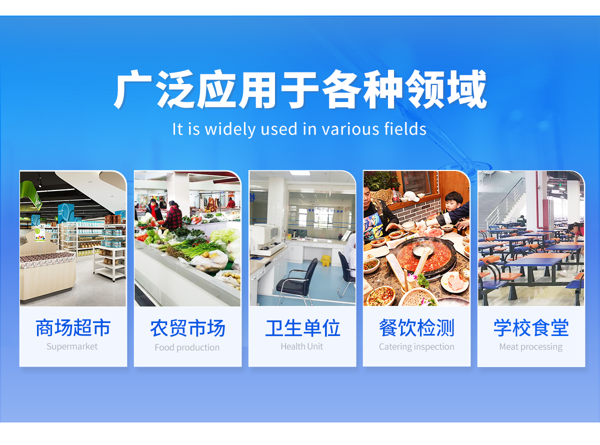 廣泛應用于主要用于蔬菜、水果、茶葉、糧食、農副產品等食品中有機磷和氨基甲酸酯類農藥殘留的快速檢測;此外還可用于果蔬茶生產基地和農貿批發(fā)銷售市場現場檢測,餐館、學校、食堂、家庭果蔬加工前的安全速測等,為廣大人民的生活安全提供保障。