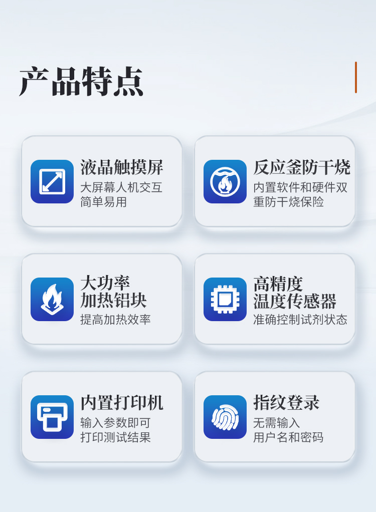 | 1. ☆采用濾袋技術(shù),濾袋孔徑25μm | 2. 耐腐蝕、耐高壓、特殊處理消煮鍋,安全可靠,經(jīng)久耐用 | 3. 彩色液晶觸摸屏,界面簡潔,操作簡單 | 4. ☆全自動(dòng)測試過程,包括自動(dòng)添加各種試劑、消煮、加熱、控溫、定時(shí)攪拌、清洗和排廢,無需人員值守 | 5. ☆**間歇攪拌技術(shù),模擬手工攪拌,使樣品處理更均勻,攪拌徹底、均勻,無試劑漏液風(fēng)險(xiǎn),安全可靠,攪拌速度15圈/分鐘,間歇周期1分鐘 | 6. **批處理能力,批處理能力為30個(gè)/批,效率高,節(jié)省試劑 | 7. ☆自動(dòng)根據(jù)樣品數(shù)量添加試劑,降低使用成本 | 8. 獨(dú)立的酸液、堿液、蒸餾水耐腐蝕精密加液泵,使用可靠,更安全 | 9. 全面的監(jiān)控配置,包括試劑量、溫度、壓力監(jiān)測 | 10. ☆儀器內(nèi)置250組用戶自定義測試方案,使用更簡潔 | 11. 儀器具備定時(shí)啟動(dòng)功能,測試更方便 | 12. ☆儀器采用高壓密閉測試,無需冷卻水,節(jié)水環(huán)保 | 13. 儀器可以直接在普通實(shí)驗(yàn)室環(huán)境,無需通風(fēng)櫥 | 14. 儀器內(nèi)部無危險(xiǎn)的玻璃材質(zhì)器件,安全可靠 |