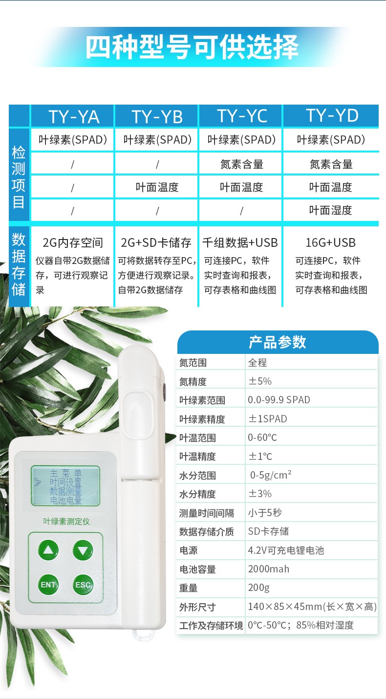 氮素含量一般情況下直接反應(yīng)作物的健康情況,生長(zhǎng)狀態(tài)、了解植物真實(shí)的硝基需求量和土壤硝基的缺乏程度或是否過多地施加了氮肥,廣泛應(yīng)用于氮肥管理,除草劑應(yīng)用,葉片衰老,環(huán)境脅迫等研究,葉綠素測(cè)量?jī)x在農(nóng)業(yè)種植過程中有很大的意義。 葉 綠素含量的測(cè)定結(jié)果是SPAD值,是葉片在兩種波長(zhǎng)650nm 和940nm,葉片傳輸光的數(shù)量進(jìn)行比值計(jì)算,來確定葉片當(dāng)前葉綠素的相對(duì)數(shù)量(兩種波長(zhǎng)范圍內(nèi)的透光系數(shù)來確定葉片當(dāng)前葉綠素的相對(duì)數(shù)量 ),SPAD值與葉綠素之間成正比關(guān)系,因此SPAD值往往間接地可代表葉綠素值,從而可以評(píng)估植物健康狀況、生長(zhǎng)狀態(tài),因而在農(nóng)業(yè)中,時(shí)常使用葉綠素計(jì) 來進(jìn)行對(duì)植物葉綠素含量進(jìn)行檢測(cè),以此來進(jìn)行指導(dǎo)氮肥的施用量,因而在農(nóng)業(yè)種植過程中使用葉綠素計(jì)來進(jìn)行指導(dǎo)氮元素含量的施肥,同時(shí)在很多植物中,以此來 進(jìn)行判斷植物的抗逆性。 葉溫常用來表示植物的體溫狀況,植物葉片中所有的化學(xué)反應(yīng),都受葉片溫度的影響,在植物生理活動(dòng)的分析中經(jīng)常用到。葉溫與 氣溫的差值,可以表明植物的缺水情況或受旱程度。因?yàn)楫?dāng)水分供應(yīng)充足時(shí),植物蒸騰正常,蒸騰耗熱可以降低植物體溫,這時(shí)葉溫比氣溫低;反之受旱時(shí),植物體 溫上升,可高于當(dāng)時(shí)的氣溫。