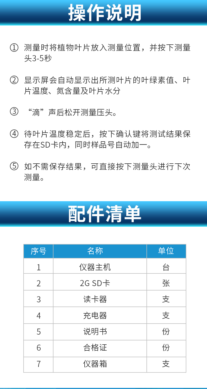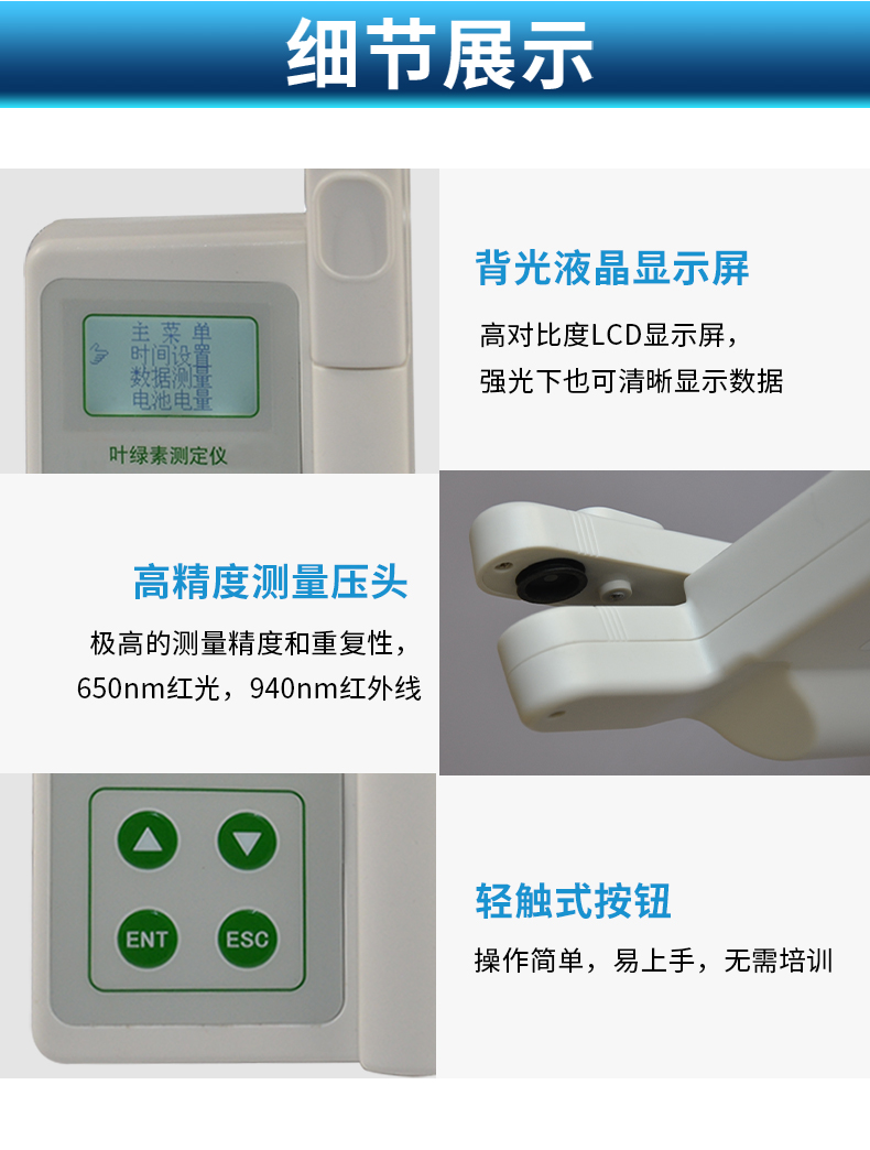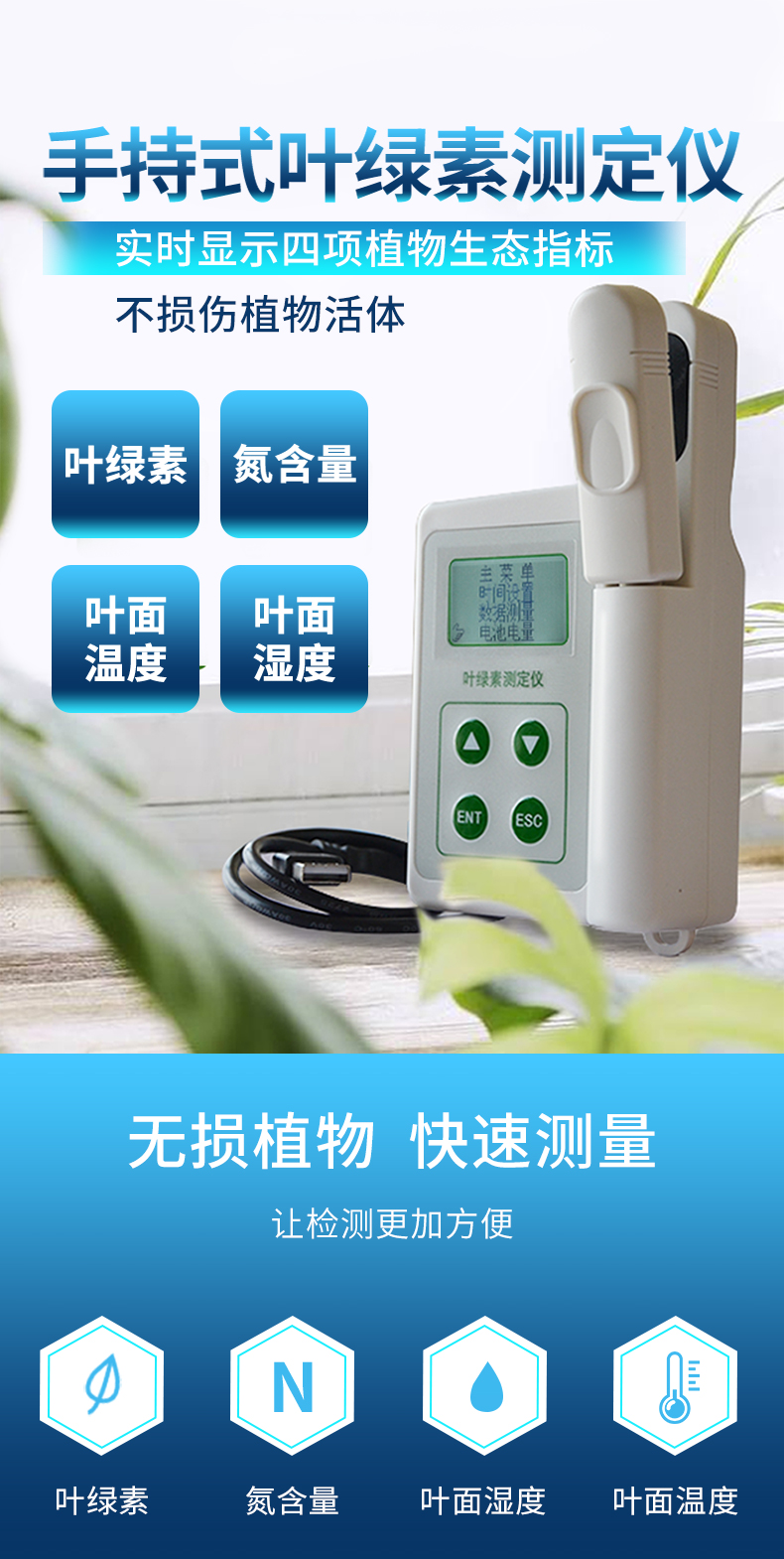 | 快速無損植物活體檢測(cè),不影響植物成長(zhǎng)。 | 一次操作可同時(shí)測(cè)定所有參數(shù),實(shí)時(shí)顯示。 | 氮,葉綠素,葉溫三種參數(shù)同一屏幕同時(shí)顯示,且可同時(shí)儲(chǔ)存 | 歷史數(shù)據(jù)查看,即可順序查看。 | 測(cè)量數(shù)據(jù)可連接計(jì)算機(jī)將測(cè)量數(shù)據(jù)導(dǎo)出,便于植物養(yǎng)分的管理和分析。 | 歷史數(shù)據(jù)查看,即可順序查看,也可跳轉(zhuǎn)查看。 | 意外斷電后已保存在主機(jī)里的數(shù)據(jù)不丟失。 | 對(duì)于歷史數(shù)據(jù)可以一鍵式全部刪除。 | 可連接計(jì)算機(jī)將測(cè)量數(shù)據(jù)導(dǎo)出,便于植物養(yǎng)分的管理和分析。 | 使用鋰電池供電,帶背光功能。 | 每種參數(shù)的報(bào)表、曲線圖均可選擇時(shí)段查詢查看。 | 可將存儲(chǔ)記錄的數(shù)據(jù)以EXCEL格式備份保存,方便以后調(diào)用。 | 可將存儲(chǔ)記錄的數(shù)據(jù)曲線圖以BMP圖片格式備份保存,方便以后調(diào)用。 |