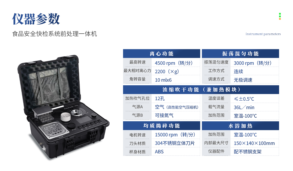 產(chǎn)品介紹: 應(yīng)國內(nèi)用戶的實際需求,自行研制開發(fā)的新型儀器——QC05型樣品前處理一體機。樣品前處理集成箱將樣本前處理過程中樣品濃縮、水浴恒溫、離心分層、均質(zhì)、振蕩混勻等步驟所需設(shè)備進行集成,僅需一臺樣品前處理集成箱設(shè)備即可完成所有樣本前處理過程,并且方便攜帶,不僅適用于現(xiàn)場檢測使用,還可用