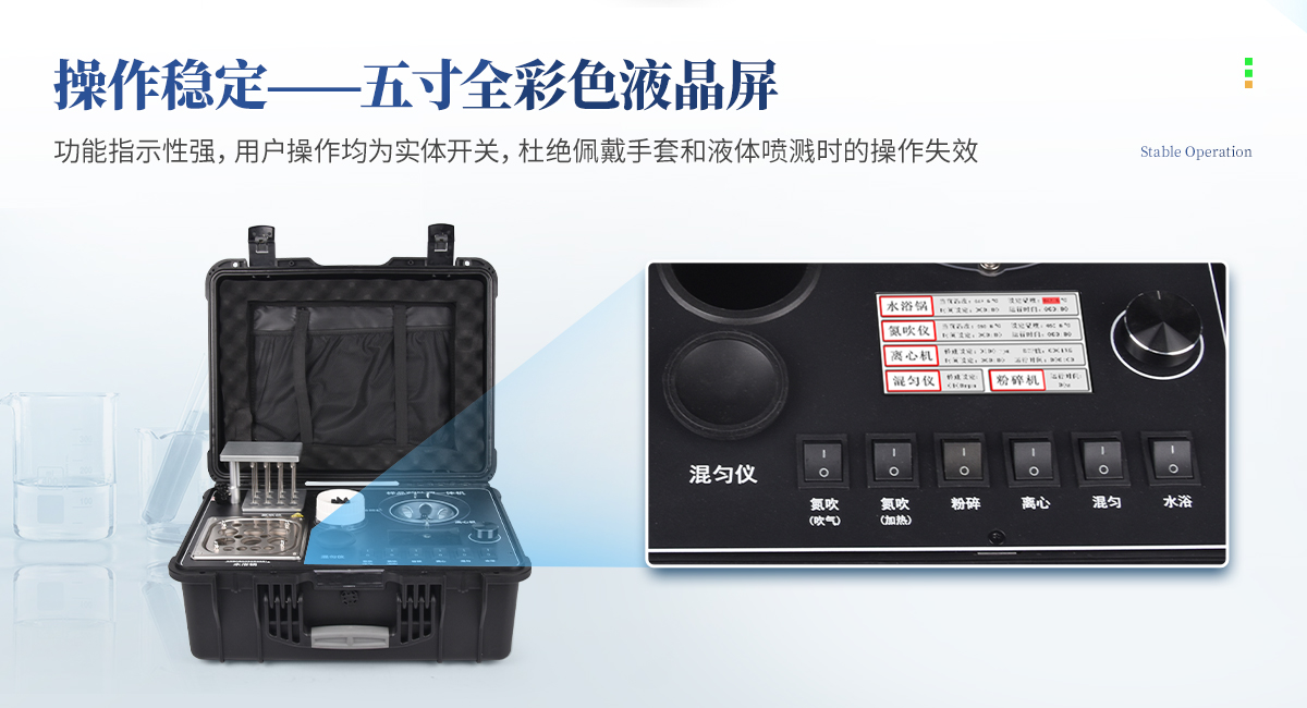 | 1、功能緊湊,集成五種樣品前處理常用的功能,完成樣品一站式處理。 | 2、結(jié)構(gòu)穩(wěn)固,機箱采用***工程塑料,具備**的抗沖擊性、耐腐蝕性、便攜性。 | 3、操作穩(wěn)定,機器采用五寸全彩色液晶屏,功能指示性強,用戶操作均為實體開關(guān),杜絕佩戴手套和液體噴濺時的操作失效。 |