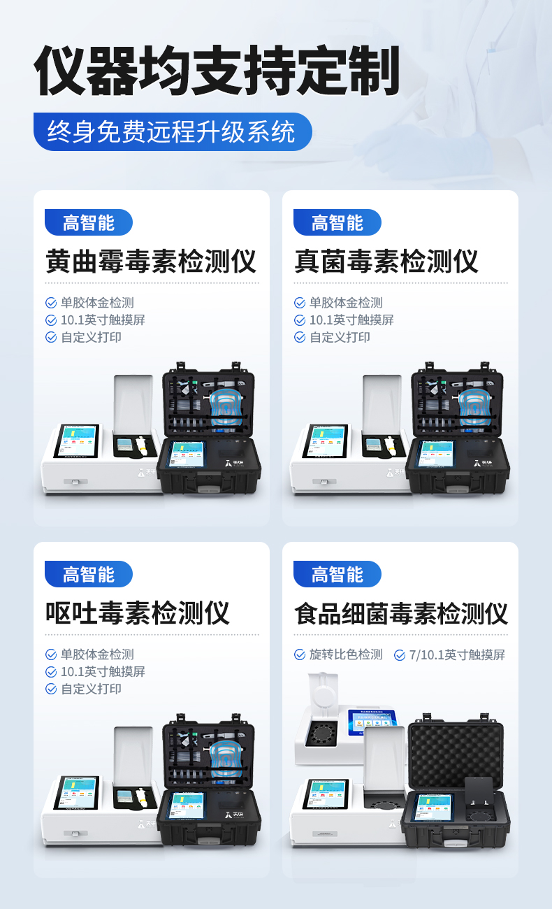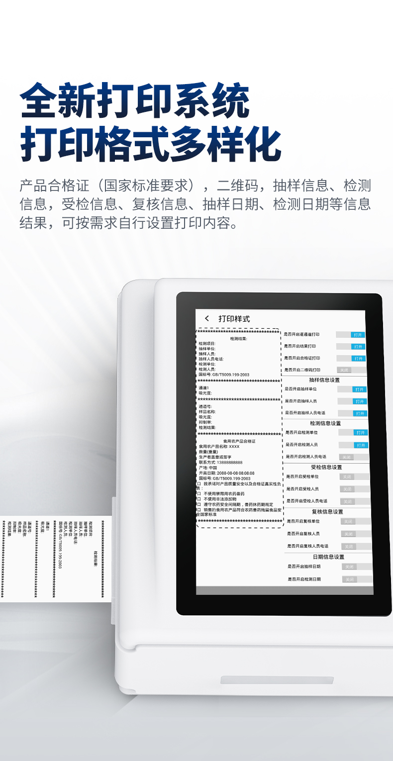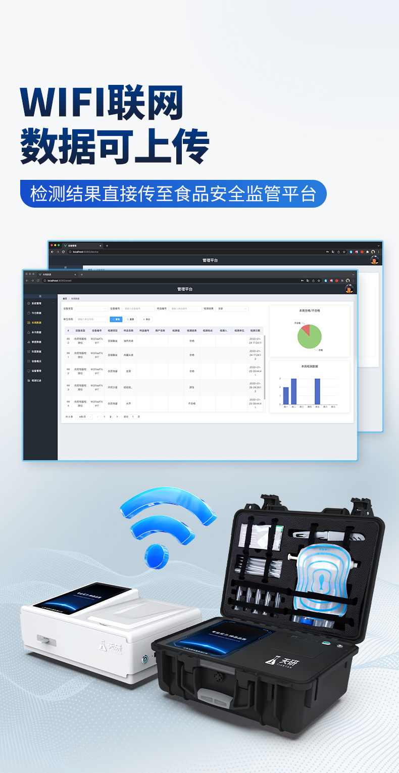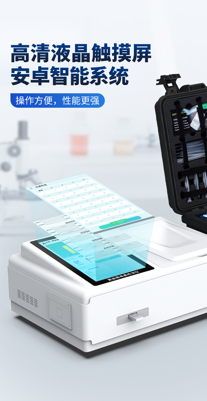 | 1、儀器采用10.1英寸液晶觸摸屏顯,搭配運行安卓智能操作系統(tǒng),主控芯片采用ARM Cortex-A7,RK3288/4核處理器,主頻1.88Ghz,運轉速度更快速,性能更強。 | 2、儀器功能包括:膠體金檢測模塊、數(shù)字化管理模塊、無線通訊模塊等,可以滿足同一軟件下實現(xiàn)所有檢測項目的檢測,并在同一窗口展示檢測結果。 | 3.一體化臺式快檢設備,采用交直流兩用供電方式,可連接車載電源,配備6ah大容量充電鋰電池,可以滿足現(xiàn)場及流動檢測使用的需求。儀器尺寸:43×35×20cm, 主機凈重:5.1kg | 4、系統(tǒng)自帶數(shù)據(jù)集成模塊,設備首頁自動統(tǒng)計檢測數(shù)據(jù)包含:周檢測數(shù)據(jù)、月檢測數(shù)據(jù),全部檢測總數(shù)量,均包含檢測總數(shù),合格數(shù),不合格數(shù),以及相關柱形分析圖,對各項檢測數(shù)據(jù)清晰掌握,無需電腦查詢,更加快捷直觀。 | 5、儀器具有任務預設模塊,可在樣品送檢前提前預設樣品名稱、檢測指標、送檢單位等信息,樣品送檢時一鍵調取保存信息,檢測更加方便快捷。 | 6、膠體金檢測模塊: | 直插式自動掃描方式,可實時顯示金標卡實時圖像,系統(tǒng)自動分析并呈現(xiàn)出CT曲線圖,CT線自動識別,無需手動調整,完成檢測后自動退出檢測卡。 | 結果判定線可修改,對照值標定值可保存,斷電不丟失數(shù)據(jù)。 | 兼容市場上其他膠體金卡,使用耗材不受限制,極大增強用戶使用體驗。 | 7、儀器檢測系統(tǒng)擁有龐大數(shù)據(jù)庫,并且構建了完善的檢索、修訂功能。食品庫涵蓋多種樣品名稱,可按需添加或刪除、編輯樣品名稱;產(chǎn)品數(shù)據(jù)庫以及歷史檢測記錄支持一鍵檢索功能。 | 8、系統(tǒng)打印自定義化,打印格式多樣化,產(chǎn)品合格證(國家標準要求),二維碼,抽樣信息、檢測信息,受檢信息、復核信息、抽樣日期、檢測日期等信息結果,可按需求自行設置打印內容。 | 9、A4紙版本報告打印功能(可選配):設備擁有兩種結果展示方式,可以自動生成A4打印模板和小票打印模板兩種樣式,可通過WiFi及網(wǎng)線等方式鏈接外置打印機可進行打印 | 10、儀器具有 wifi 聯(lián)網(wǎng)上傳、RJ45網(wǎng)線連接功能,可以快速上傳數(shù)據(jù)。同步對接監(jiān)管平臺,數(shù)據(jù)可局域網(wǎng)和互聯(lián)網(wǎng)數(shù)據(jù)上傳,檢測結果直接傳至食品安全監(jiān)管平臺。進行區(qū)域食品安全監(jiān)管及大數(shù)據(jù)分析處理與數(shù)據(jù)統(tǒng)計,檢測區(qū)域食品安全長短期動態(tài),達到食品安全問題預估、預警。 | 11、設備支持U盤存儲,標準USB接口,免驅動安裝。檢測結果存儲容量20萬條以上,可生成Excel表格,進行一鍵拷貝,并具有登錄保護功能,可設置用戶名及密碼,規(guī)范不同人員操作權限,防止非工作人員操作,并且可以進行重新校準、鎖定、恢復出廠設置功能。儀器固件可升級,后期檢測項目可擴充。 | 12、儀器具備遠程升級功能,可定向分客戶分儀器更新,開機后自動更新,并可持續(xù)性免費更新系統(tǒng)版本,無需像傳統(tǒng)產(chǎn)品返廠更新,節(jié)省時間及人力成本并避免了物流運輸返廠升級導致設備損壞的潛在風險。 |