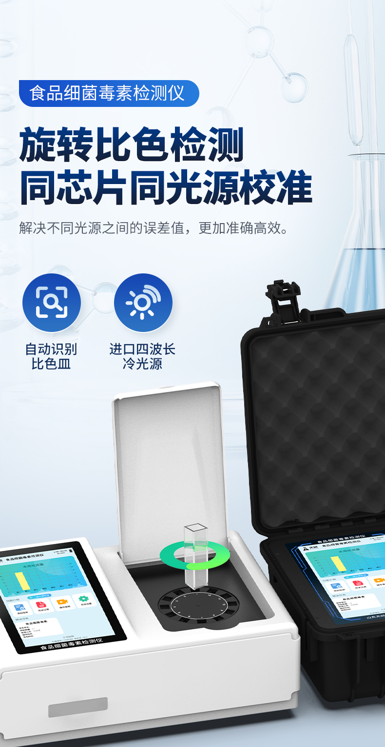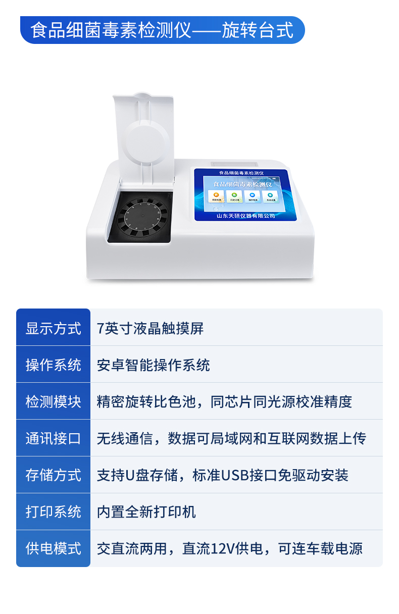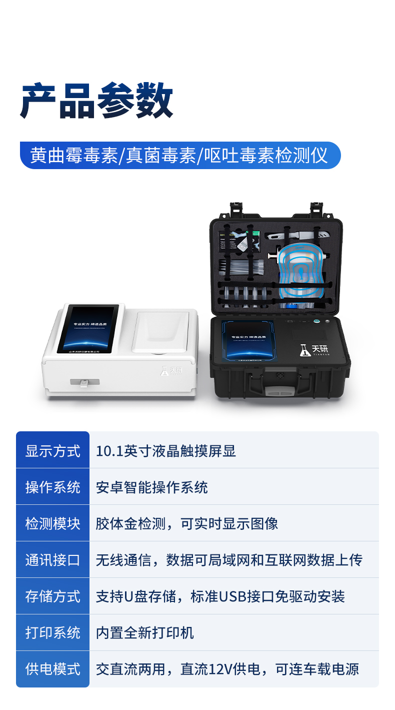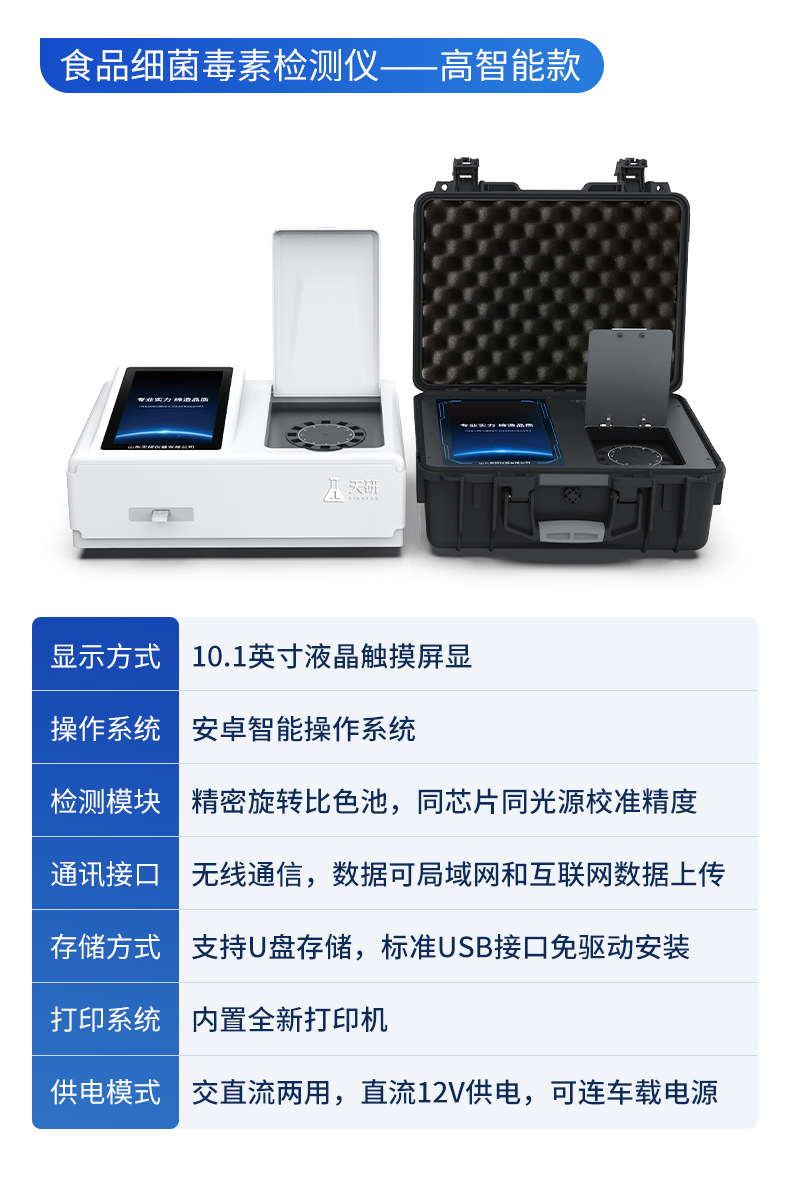 | 1、儀器采用10.1英寸液晶觸摸屏顯,搭配運行安卓智能操作系統(tǒng),主控芯片采用ARM Cortex-A7,RK3288/4核處理器,主頻1.88Ghz,運轉速度更快速,性能更強。 | 2、儀器功能包括:膠體金檢測模塊、數(shù)字化管理模塊、無線通訊模塊等,可以滿足同一軟件下實現(xiàn)所有檢測項目的檢測,并在同一窗口展示檢測結果。 | 3.一體化臺式快檢設備,采用交直流兩用供電方式,可連接車載電源,配備6ah大容量充電鋰電池,可以滿足現(xiàn)場及流動檢測使用的需求。儀器尺寸:43×35×20cm, 主機凈重:5.1kg | 4、系統(tǒng)自帶數(shù)據(jù)集成模塊,設備首頁自動統(tǒng)計檢測數(shù)據(jù)包含:周檢測數(shù)據(jù)、月檢測數(shù)據(jù),全部檢測總數(shù)量,均包含檢測總數(shù),合格數(shù),不合格數(shù),以及相關柱形分析圖,對各項檢測數(shù)據(jù)清晰掌握,無需電腦查詢,更加快捷直觀。 | 5、儀器具有任務預設模塊,可在樣品送檢前提前預設樣品名稱、檢測指標、送檢單位等信息,樣品送檢時一鍵調取保存信息,檢測更加方便快捷。 | 6、膠體金檢測模塊: | 直插式自動掃描方式,可實時顯示金標卡實時圖像,系統(tǒng)自動分析并呈現(xiàn)出CT曲線圖,CT線自動識別,無需手動調整,完成檢測后自動退出檢測卡。 | 結果判定線可修改,對照值標定值可保存,斷電不丟失數(shù)據(jù)。 | 兼容市場上其他膠體金卡,使用耗材不受限制,極大增強用戶使用體驗。 | 7、儀器檢測系統(tǒng)擁有龐大數(shù)據(jù)庫,并且構建了完善的檢索、修訂功能。食品庫涵蓋多種樣品名稱,可按需添加或刪除、編輯樣品名稱;產(chǎn)品數(shù)據(jù)庫以及歷史檢測記錄支持一鍵檢索功能。 | 8、系統(tǒng)打印自定義化,打印格式多樣化,產(chǎn)品合格證(國家標準要求),二維碼,抽樣信息、檢測信息,受檢信息、復核信息、抽樣日期、檢測日期等信息結果,可按需求自行設置打印內容。 | 9、A4紙版本報告打印功能(可選配):設備擁有兩種結果展示方式,可以自動生成A4打印模板和小票打印模板兩種樣式,可通過WiFi及網(wǎng)線等方式鏈接外置打印機可進行打印 | 10、儀器具有 wifi 聯(lián)網(wǎng)上傳、RJ45網(wǎng)線連接功能,可以快速上傳數(shù)據(jù)。同步對接監(jiān)管平臺,數(shù)據(jù)可局域網(wǎng)和互聯(lián)網(wǎng)數(shù)據(jù)上傳,檢測結果直接傳至食品安全監(jiān)管平臺。進行區(qū)域食品安全監(jiān)管及大數(shù)據(jù)分析處理與數(shù)據(jù)統(tǒng)計,檢測區(qū)域食品安全長短期動態(tài),達到食品安全問題預估、預警。 | 11、設備支持U盤存儲,標準USB接口,免驅動安裝。檢測結果存儲容量20萬條以上,可生成Excel表格,進行一鍵拷貝,并具有登錄保護功能,可設置用戶名及密碼,規(guī)范不同人員操作權限,防止非工作人員操作,并且可以進行重新校準、鎖定、恢復出廠設置功能。儀器固件可升級,后期檢測項目可擴充。 | 12、儀器具備遠程升級功能,可定向分客戶分儀器更新,開機后自動更新,并可持續(xù)性免費更新系統(tǒng)版本,無需像傳統(tǒng)產(chǎn)品返廠更新,節(jié)省時間及人力成本并避免了物流運輸返廠升級導致設備損壞的潛在風險。 |