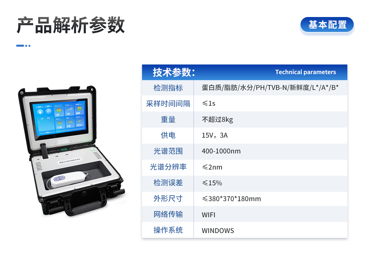 | 1. ※檢測指標:蛋白質(zhì)、脂肪、水分、PH、TVB-N、新鮮度、L*、A*、B* | 2. 采樣時間間隔:≤1s | 3. 重量:不超過8kg | 4. 供電:15V,3A | 5. 觸摸液晶顯示屏操作,屏幕尺寸不小于11寸 | 6. ※光譜范圍:400-1000nm | 7. ※光譜分辨率:≤2nm | 8. 檢測誤差:≤15% | 9. ※提供模型自動優(yōu)化平臺,用戶可通過設(shè)備建立和優(yōu)化算法模型 | 10. 外形尺寸:≤380*370*180mm | 11. 網(wǎng)絡(luò)傳輸:WIFI | 12. 操作系統(tǒng):WINDOWS | 13. 采用便攜式手提箱設(shè)計,外殼為ABS防沖擊材料,適合在現(xiàn)場快速檢測 |