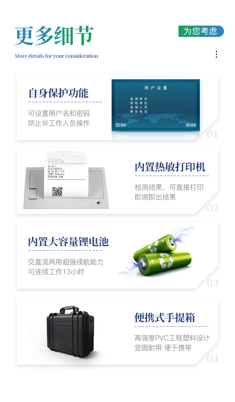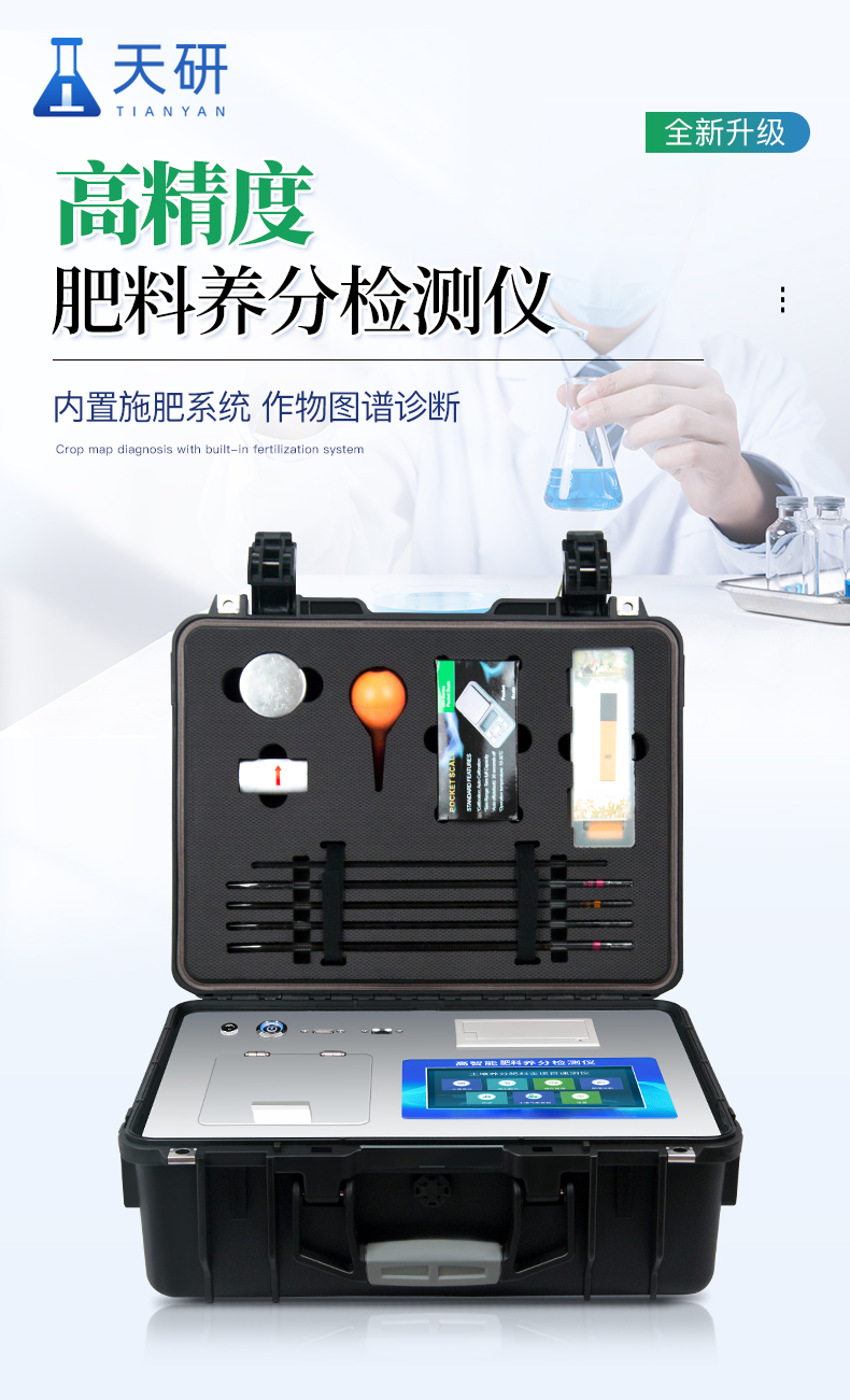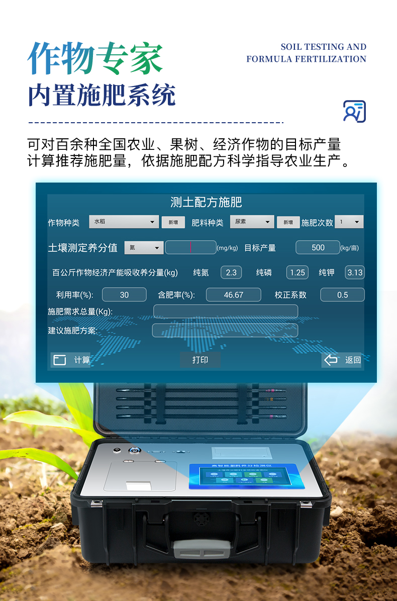 | 可檢測化肥、有機(jī)肥(含葉面肥、水溶肥、噴施肥等)、植株中的速效氮、速效磷、有效鉀、全氮、全磷、全鉀、有機(jī)質(zhì)、酸堿度,鈣、鎂、硫、鐵、錳、硼、鋅、銅、氯、硅、鉬等各種中微量元素以及鉛、鉻、鎘、汞、砷、鎳、鋁、氟、鈦、硒等各種重金屬含量。 | 安卓智能操作系統(tǒng),采用更加**和人性化操作,儀器標(biāo)配wifi聯(lián)網(wǎng)上傳、4G聯(lián)網(wǎng)傳輸、GPRS無線遠(yuǎn)傳,快速上傳數(shù)據(jù)。 | 內(nèi)置作物專家施肥系統(tǒng),可對百余種全國農(nóng)業(yè)、果樹、經(jīng)濟(jì)作物的目標(biāo)產(chǎn)量計(jì)算推薦施肥量,依據(jù)施肥配方科學(xué)指導(dǎo)農(nóng)業(yè)生產(chǎn)。 | 采用精密旋轉(zhuǎn)比色池設(shè)計(jì),光源一致性更加**保證檢測精度。一次性可快速檢測12個(gè)樣品,極大提升檢測效率,降低檢測成本。 | 內(nèi)置植物營養(yǎng)診斷標(biāo)準(zhǔn)圖譜,根據(jù)各農(nóng)作物營養(yǎng)缺失的圖片,進(jìn)行葉面對比,診斷豐缺。 | 采用高精度濾光片技術(shù)自主**分析方法(**號:ZL 2018 2 1777724.7),比色槽部分采用標(biāo)準(zhǔn)1cm比色皿,無機(jī)械位移及磨損,光路測試定位**,保證檢測結(jié)果優(yōu)于國標(biāo)要求。 | 儀器配有數(shù)據(jù)接收平臺,無需數(shù)據(jù)線,數(shù)據(jù)可直接局域網(wǎng)和互聯(lián)網(wǎng)無線上傳,方便進(jìn)行數(shù)據(jù)管理和數(shù)據(jù)長期分析。 | 儀器內(nèi)置新一代高速熱敏打印機(jī),檢測完成可自動打印檢測報(bào)告和二維碼。 | 高靈敏7寸電容觸摸屏,高清晰高交互顯示,大程度降低傳統(tǒng)儀器的繁瑣操作和失誤。 | 每個(gè)通道均配置四波長冷光源,所有光源實(shí)現(xiàn)恒流穩(wěn)壓,保證波長穩(wěn)定。 硅半導(dǎo)體作為信號接收系統(tǒng),壽命長達(dá)10萬小時(shí)級別。重現(xiàn)性好,準(zhǔn)確度高。 | 高強(qiáng)度PVC工程塑料手提箱設(shè)計(jì),堅(jiān)固耐用,便于攜帶,供電方式為交直流兩用,可野外流動測試配套成品藥劑。 |