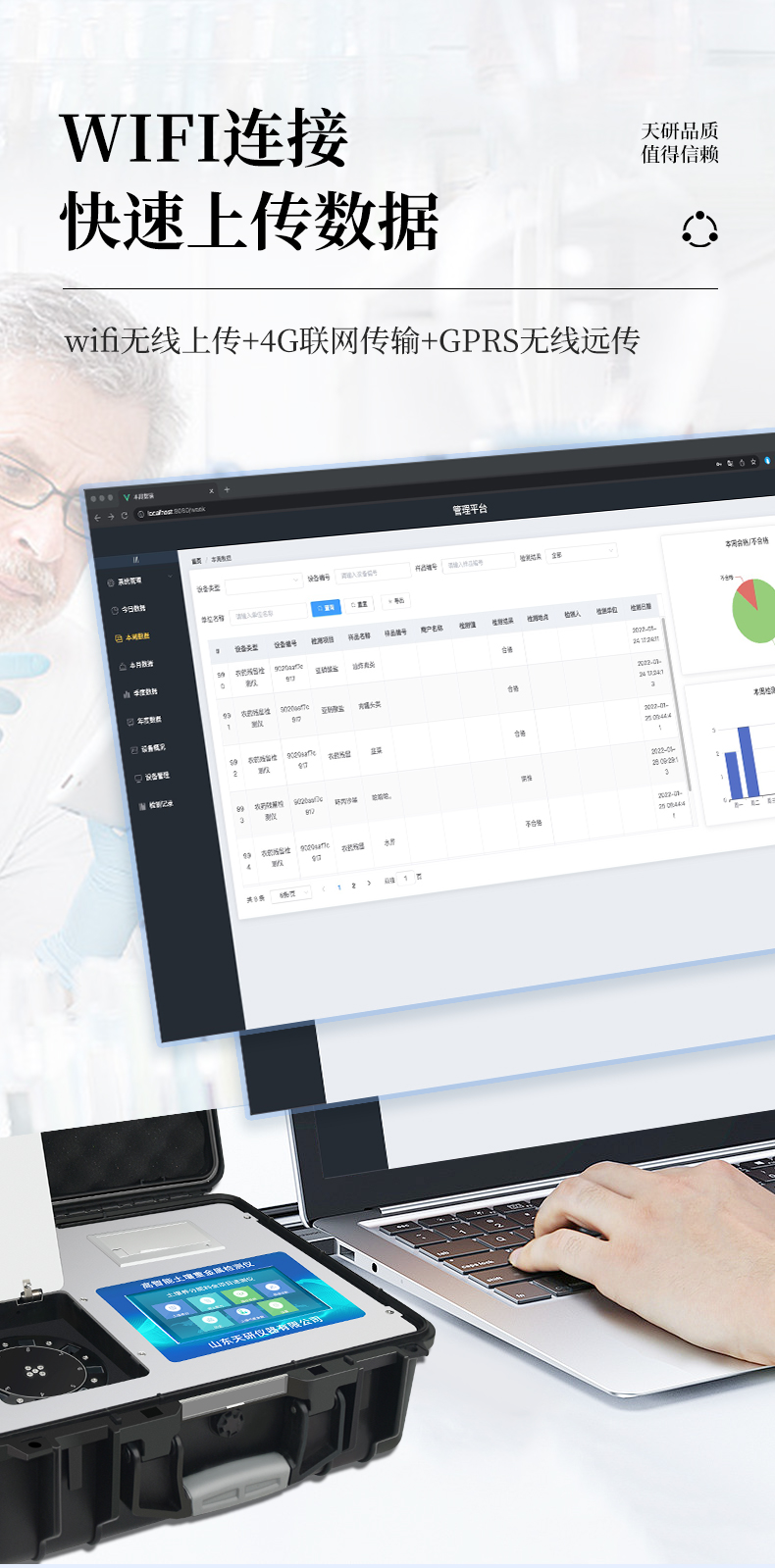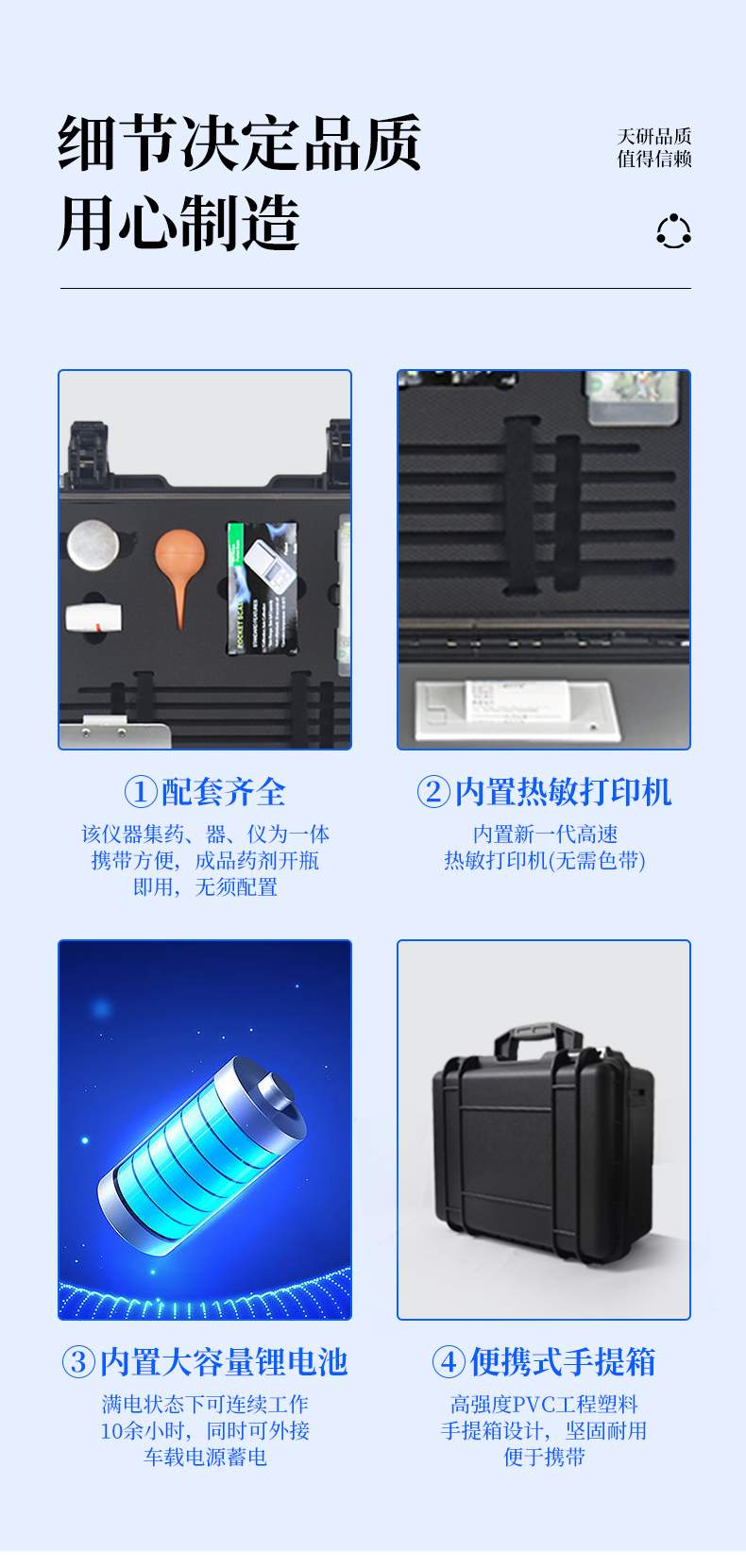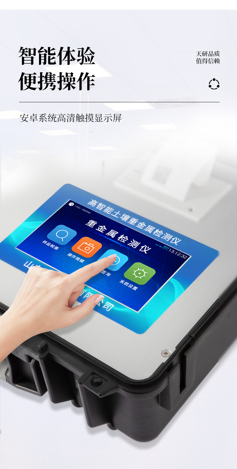 | Android安卓智能操作系統(tǒng),主控芯片采用ARM Cortex-A7,RK3288/4核處理器,主頻1.88Ghz,運(yùn)轉(zhuǎn)速度更快速,穩(wěn)定性更強(qiáng)。 | 采用精密旋轉(zhuǎn)比色池設(shè)計(jì),光源一致性更加**,保證檢測(cè)精度。 | 12個(gè)旋轉(zhuǎn)檢測(cè)通道,一次性可快速檢測(cè)12個(gè)樣品,極大提升檢測(cè)效率,降低檢測(cè)成本。 | 采用高精度濾光片技術(shù)自主**分析方法(**號(hào):ZL 2018 2 1777724.7),**認(rèn)證。 | 檢測(cè)過(guò)程中內(nèi)置校準(zhǔn)功能,智能恒流穩(wěn)壓,光強(qiáng)自動(dòng)校準(zhǔn),確保檢測(cè)準(zhǔn)確度。 | 儀器標(biāo)配wifi無(wú)線(xiàn)上傳、4G聯(lián)網(wǎng)傳輸、GPRS無(wú)線(xiàn)遠(yuǎn)傳,快速上傳數(shù)據(jù)。 | 配有云平臺(tái),儀器連入無(wú)線(xiàn)網(wǎng)絡(luò)后,可將檢測(cè)數(shù)據(jù)可選擇性或批量無(wú)線(xiàn)上傳,方便用戶(hù)進(jìn)行長(zhǎng)期數(shù)據(jù)管理和可視化分析。 | 儀器配同時(shí)具有USB接口、以太網(wǎng)接口,內(nèi)置大容量?jī)?nèi)存,并可隨時(shí)用U盤(pán)拷貝數(shù)據(jù)。 | 可用手機(jī)隨時(shí)登錄云平臺(tái)在線(xiàn)移動(dòng)查看歷史數(shù)據(jù) | 4波長(zhǎng)專(zhuān)業(yè)測(cè)試?yán)涔庠?紅、藍(lán)、綠、橙),光源波長(zhǎng)穩(wěn)定,長(zhǎng)時(shí)間連續(xù)工作光源無(wú)溫漂現(xiàn)象,壽命長(zhǎng)達(dá)10萬(wàn)小時(shí)級(jí)別,重現(xiàn)性好,準(zhǔn)確度高。 | 比色池部分采用標(biāo)準(zhǔn)1cm比色皿,無(wú)機(jī)械位移及磨損,光路測(cè)試定位**,有效屏蔽外光干擾,保證檢測(cè)結(jié)果優(yōu)于國(guó)標(biāo)要求。 | 儀器系統(tǒng)內(nèi)帶有樣品前處理操作視頻,各種樣品檢測(cè)方法點(diǎn)擊視頻模塊即可觀看,檢測(cè)人員無(wú)需自學(xué)說(shuō)明書(shū),指導(dǎo)教學(xué)方便快速,方便新手快速操作 | 內(nèi)置新一代高速熱敏打印機(jī)(無(wú)需色帶),打印內(nèi)容包含:檢測(cè)單位、檢測(cè)人員、檢測(cè)項(xiàng)目、通道號(hào)、吸光度、含量(mg/kg)、檢測(cè)時(shí)間、以及二維碼等信息 | 高靈敏7寸真彩觸摸屏,采用更加**和人性化操作,高清晰高交互顯示,大程度降低傳統(tǒng)儀器的繁瑣操作和失誤。 | 內(nèi)置時(shí)鐘功能,方便操作時(shí)間記錄,長(zhǎng)期歷史追溯。 | 可設(shè)置多賬戶(hù)賬號(hào)密碼登錄,**UI交互界面,不同的用戶(hù)可自由添加編輯檢測(cè)信息,保存后可長(zhǎng)期使用。 | GPS功能:可在野外作業(yè)時(shí)記錄經(jīng)緯度地點(diǎn),滿(mǎn)足特殊用戶(hù)需求。 | 內(nèi)置低電壓提示功能,可在檢測(cè)時(shí)明確電量,避免測(cè)試數(shù)據(jù)偏移,同時(shí)具有斷電保護(hù)功能,斷電自動(dòng)保存數(shù)據(jù),防止數(shù)據(jù)丟失。 | 交直流兩用供電方式,內(nèi)置大容量充電鋰電池,滿(mǎn)電狀態(tài)下可連續(xù)工作10余小時(shí),同時(shí)可外接車(chē)載電源蓄電。 | 儀器具有中英文切換功能,可滿(mǎn)足出口要求。 | 高強(qiáng)度PVC工程塑料手提箱設(shè)計(jì),堅(jiān)固耐用,便于攜帶。 |