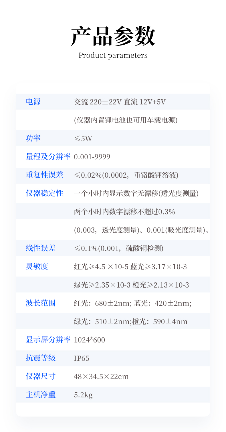 | 電源:交流 220±22V 直流 12V+5V(儀器內(nèi)置鋰電池也可用車(chē)載電源) | 功率: ≤5W | 量程及分辨率:0.001-9999 | 重復(fù)性誤差: ≤0.02%(0.0002,重鉻酸鉀溶液) | 儀器穩(wěn)定性:一個(gè)小時(shí)內(nèi)顯示數(shù)字無(wú)漂移(透光度測(cè)量);兩個(gè)小時(shí)內(nèi)數(shù)字漂移不超過(guò)0.3%(0.003,透光度測(cè)量)、0.001(吸光度測(cè)量)。 | 線(xiàn)性誤差: ≤0.1%(0.001,硫酸銅檢測(cè)) | 靈敏度:紅光≥4.5 ×10-5 藍(lán)光≥3.17×10-3 綠光≥2.35×10-3 橙光≥2.13×10-3 | 波長(zhǎng)范圍 :紅光:680±2nm; 藍(lán)光:420±2nm; 綠光:510±2nm;橙光:590±4nm | 顯示屏分辨率:1024*600 | 抗震等級(jí):IP65 | 儀器尺寸:48×34.5×22cm | 主機(jī)凈重:5.2kg |