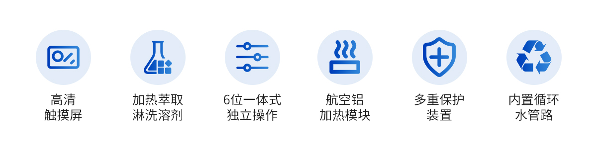 | 1.7英寸大液晶觸摸屏顯示控制,可升級程序控溫和遠程操作系統(tǒng) | 2.6位一體式金屬浴加熱系統(tǒng),保證每只樣品可獨立操作 | 3.航空鋁加熱模塊,升溫速度快,回流速度快,大大縮短提取時間 | 4.進口溫度傳感器,控溫精度高,均勻性好 | 5.自帶加熱萃取、淋洗溶劑回收功能,大大節(jié)約實驗耗材 | 6.內(nèi)置循環(huán)水管路,操作簡單方便(可升級為內(nèi)置冷卻裝置) | 7.具有過壓,過熱,漏電多重保護裝置,無需看管,保證機器長時間使用的安全性 | 8.可升級成內(nèi)置冷水系統(tǒng),無需外接水源。具有計時和時間控制的循環(huán)系統(tǒng);冷卻水全自動控制。 |