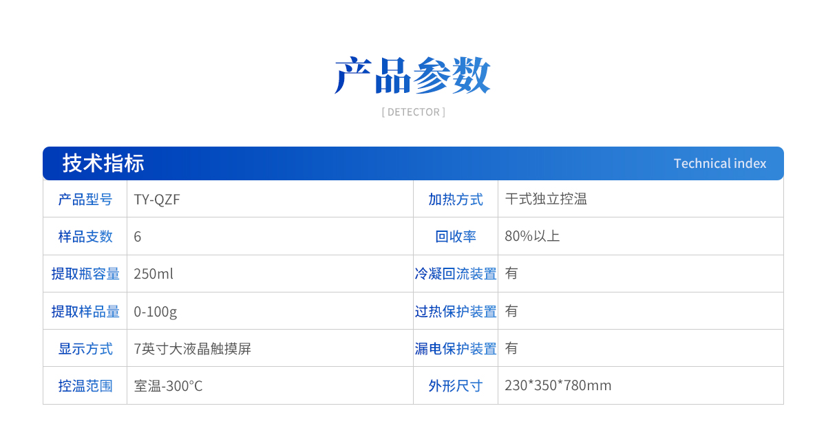 | 產(chǎn)品型號:TY-QZF 樣品支數(shù):6 提取瓶容量:250ml 提取樣品量:0-100g 顯示方式:7英寸大液晶觸摸屏 控溫范圍:室溫-300°C 加熱方式:干式獨立控溫 回收率:80%以上 冷凝回流裝置:有 過熱保護裝置:有 漏電保護裝置:有 外形尺寸mm:230*350*780 |