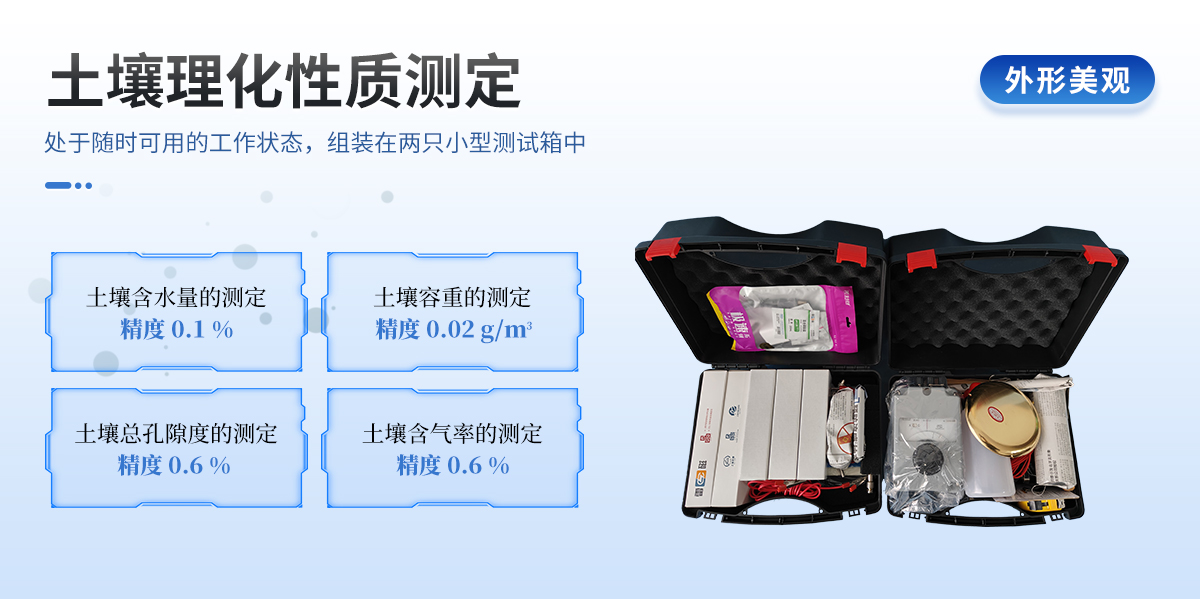 | 土壤電化學(xué)測(cè)定: 1.土壤電阻率的測(cè)定: 精度 0.1 Ω/m 2.土壤中金屬腐蝕電位的測(cè)定: 精度 ± 1 mV 3.土壤電位梯度的測(cè)定: 精度 ± 0.1 mV/m 4.土壤氧化還原電位的測(cè)定: 精度 ± 2 mV 5、土壤pH的測(cè)定: 精度 0.02 pH | 土壤理化性質(zhì)測(cè)定: 1.土壤含水量的測(cè)定: 精度 0.1 % 2.土壤容重的測(cè)定: 精度 0.02 g/m3 3.土壤總孔隙度的測(cè)定: 精度 0.6 % 4.土壤含氣率的測(cè)定: 精度 0.6 % 土壤硫化物的測(cè)定: 精度 0.1 ppm 另:土壤質(zhì)地的現(xiàn)場(chǎng)鑒別;野外土壤剖面描述及樣品采集。 |