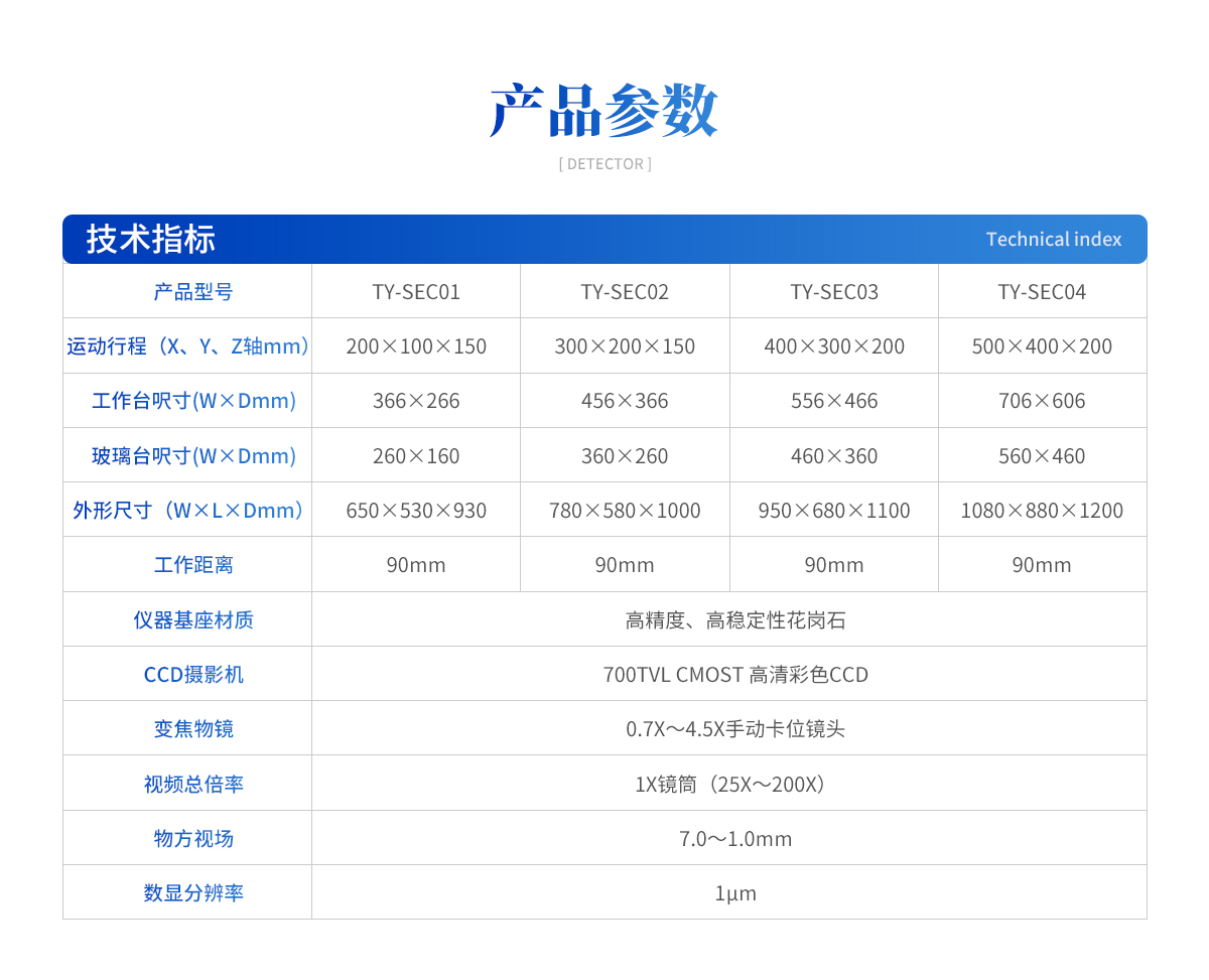 | 1、 運(yùn)動行程(X、Y、Z軸mm):500×400×200 2、 工作臺呎寸(W×Dmm): 706×606 3、 玻璃臺呎寸(W×Dmm): 560×460 4、 外形尺寸(W×L×Dmm): 1080×880×1200 5、 工作距離:90mm 6、 儀器基座材質(zhì):高精度、高穩(wěn)定性花崗石 7、 CCD攝影機(jī):700TVL COMST模擬信號相機(jī) 8、 變焦物鏡: 0、7X~4、5X手動卡位鏡頭 9、 視頻總倍率:1X鏡筒(25X~200X) 10、 物方視場: 7、0~1、0mm 11、 數(shù)顯分辨率:1μm 12、 X、Y坐標(biāo)測量示值誤差≤(3+L/200)μm , L為被測長度(單位:mm) |