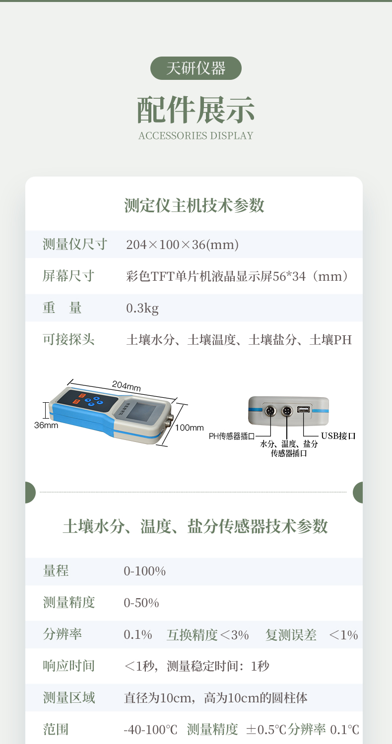 | 測量參數(shù):土壤容積含水量; | 單位:%(m3/m3); | 測試靈敏度:±0.01 %(m3/m3); | 量程:0-100%(m3/m3); | 測量精度:0-50%(m3/m3)范圍內(nèi))±2%(m3/m3);50-100%(m3/m3)范圍內(nèi))±3%(m3/m3); | 分辨率:0.1% | 測量區(qū)域:90%的影響在圍繞中央探針直徑為3cm長為6cm的圓柱體內(nèi); | 穩(wěn)定時間:通電后約10秒鐘; | 響應(yīng)時間:響應(yīng)在1秒鐘內(nèi)進入穩(wěn)定過程; | 供電方式:鋰電池或交流電 | 通訊方式:USB2.0 | 軟件: 上位機軟件免費贈送 | 線纜: 水分國標屏蔽線2米,溫度聚四氟耐高溫導(dǎo)線2米。 | 測量方式:插入式、埋藏式、剖面等 |