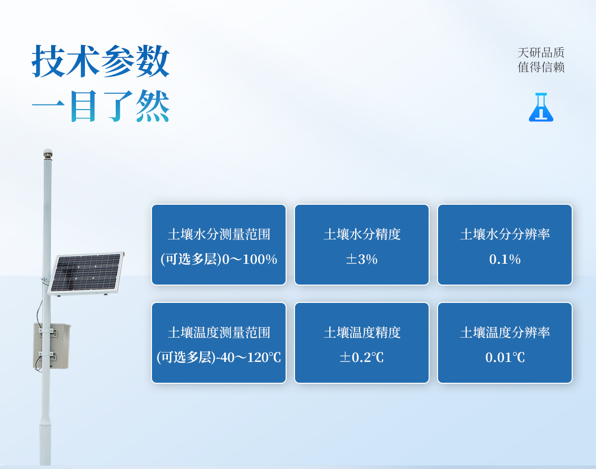 | 土壤濕度 測量范圍:0~100% 測量精度:3% | 土壤溫度 測量范圍:-30℃~70℃ 測量精度:0.1℃ | 記錄間隔:30分~24小時(可調(diào)) | 測點間距:10cm | 輸出方式:支持USB接口數(shù)據(jù)導(dǎo)出 | 傳輸方式:4G或GPRS無線傳輸 | 存儲容量:無限云端存儲 | 數(shù)據(jù)查看:移動APP查看或PC端云平臺系統(tǒng)遠程查看 | 供電方式:太陽能電池板+鋰電池組合供電 | 防護外殼:PVC | 防護等級:IP68 | 工作環(huán)境:-20℃~85℃ | 結(jié)構(gòu)外觀:集成管式(柱式) | 尺 寸:外徑6cm 高78.2cm |